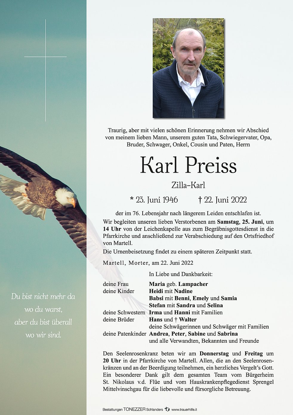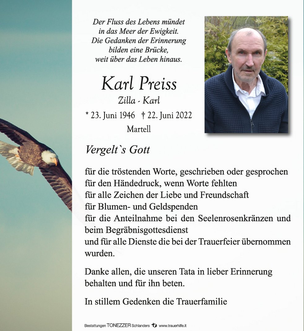 Wir begleiten unseren lieben Verstorbenen am Samstag, 25. Juni, um 14 Uhr von der Leichenkapelle aus zum Begräbnisgottesdienst in die Pfarrkirche und anschließend zur Verabschiedung auf den Ortsfriedhof von Martell.