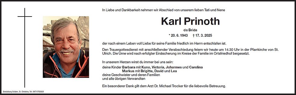 Den Trauergottesdienst mit anschließender Verabschiedung feiern wir am Mittwoch, dem 19. März, um 14.30 Uhr in der Pfarrkirche von St. Ulrich. Die Urne wird nach erfolgter Einäscherung im Kreise der Familie im Ortsfriedhof beigesetzt.