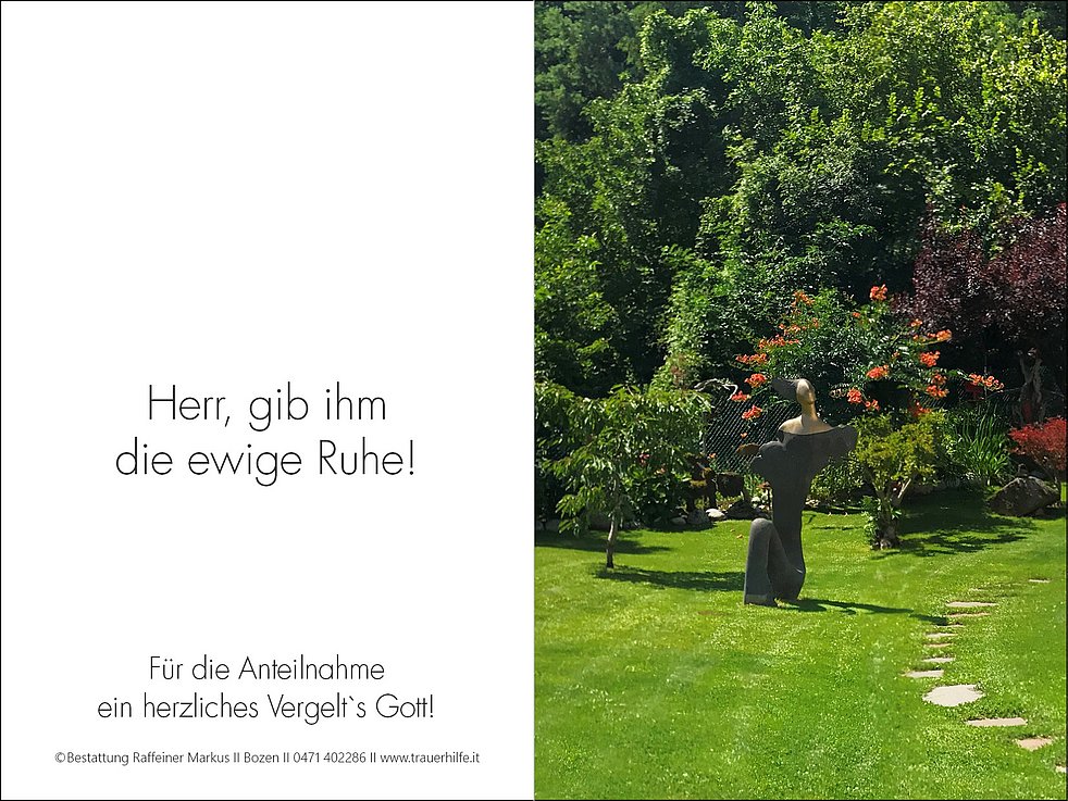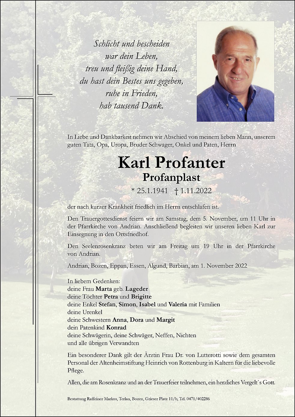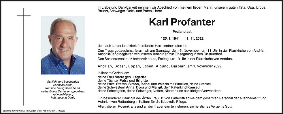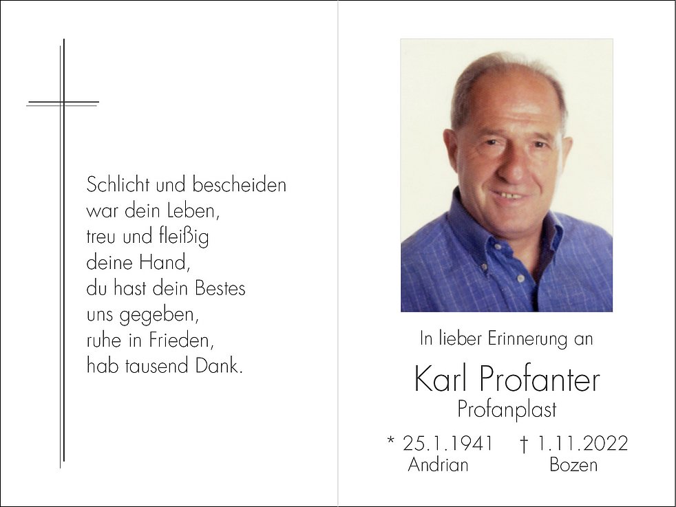 Den Trauergottesdienst feiern wir am Samstag, dem 5. November, um 11 Uhr in der Pfarrkirche von Andrian. Anschließend begleiten wir unseren lieben Karl zur Einsegnung in den Ortsfriedhof.
