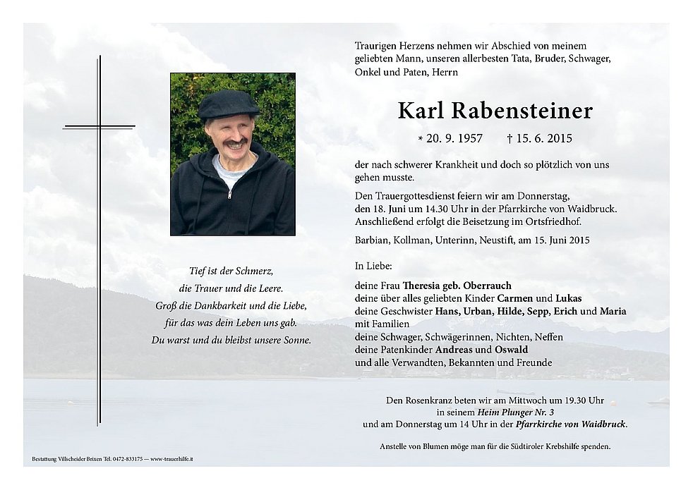 Anstelle von Blumen möge man für die Südtiroler Krebshilfe spenden.