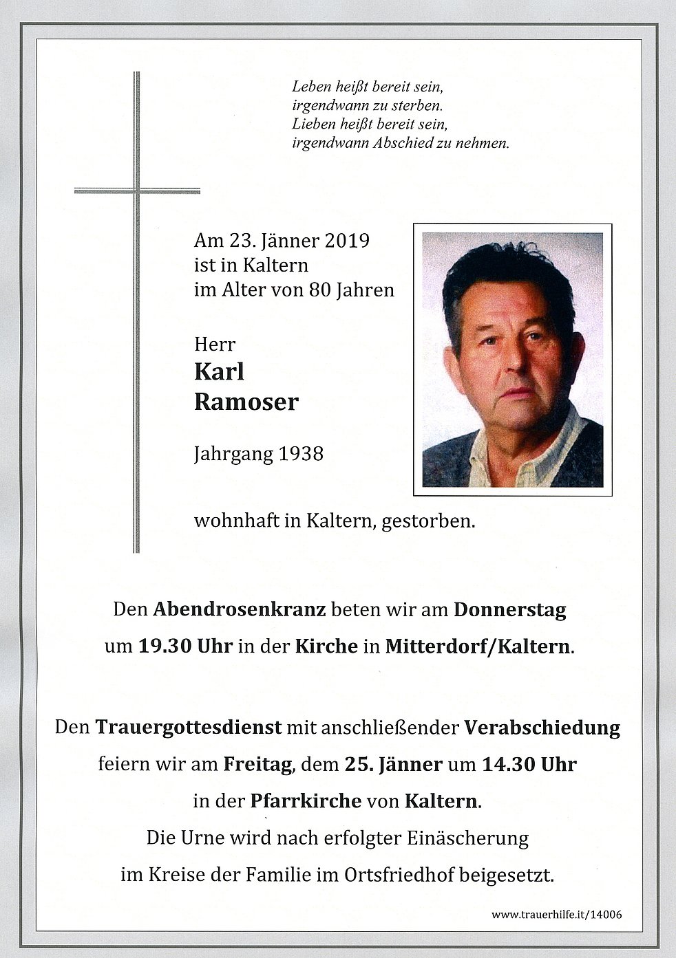 Den Trauergottesdienst mit anschließender Verabschiedung feiern wir am Freitag, dem 25. Jänner um 14.30 Uhr in der Pfarrkirche von Kaltern.