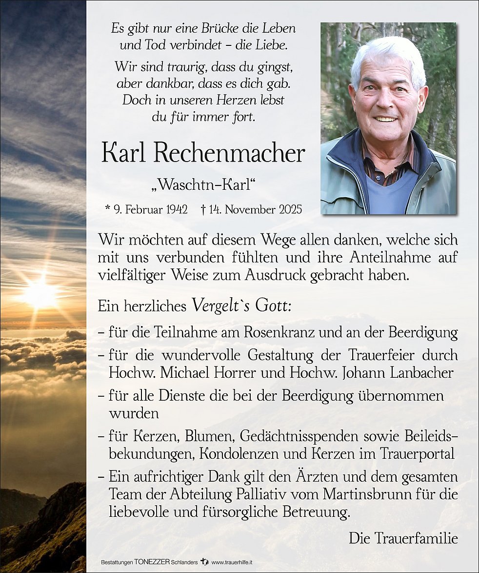 als ich vor vielen Jahren als junger Lehrer vom Pustertal in den Vinschgau kam, habe ich dich als Freund und Menschen kennen und schätzen lernen dürfen. Unvergessen bleiben für mich die gemeinsam verbrachte Zeit und die Erinnerung daran. Lieber Karl, "Begrenzt ist das Leben, doch unendlich die Erinnerung", in dieser Verbundenheit ein letzter freundschaftlicher Gruss, der Familie mein aufrichtiges Beileid!