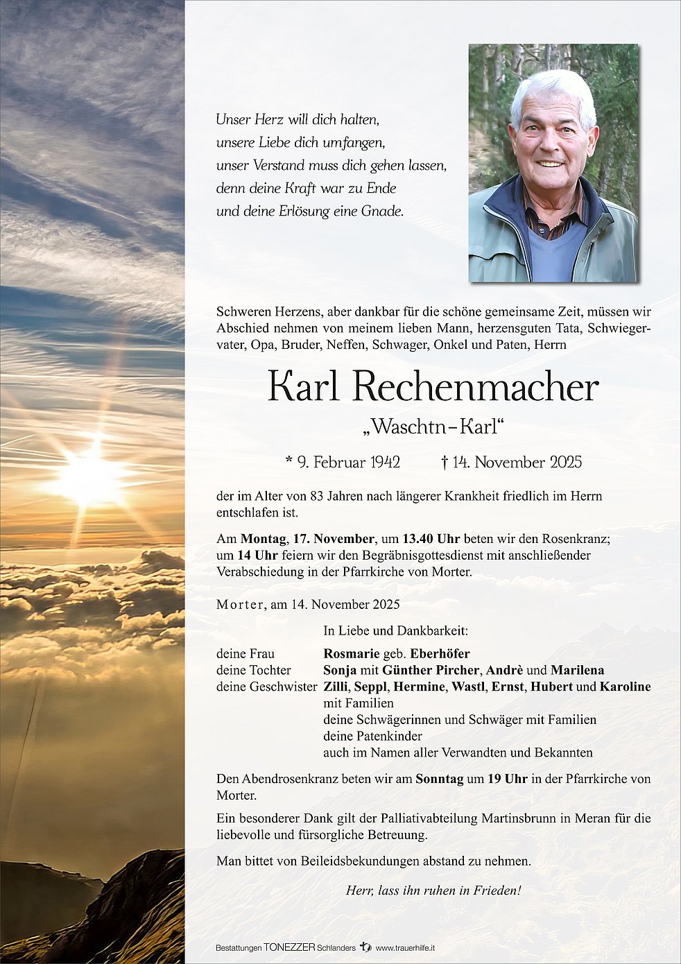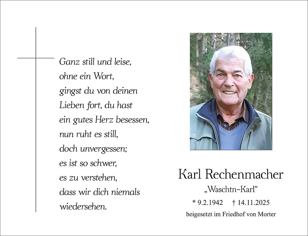 Liebe Rosmarie, liebe Sonja, Günther, Andrè, Marilena, liebe Trauerfamilien, mit tiefem Mitgefühl möchten wir euch die Hand zum stillen Gruß reichen. Der Verlust eures lieben Karl berührt uns sehr. Wir denken in diesen schweren Tagen ganz fest an euch und wünschen euch von Herzen viel Kraft, Trost und liebevolle Momente der Erinnerung.