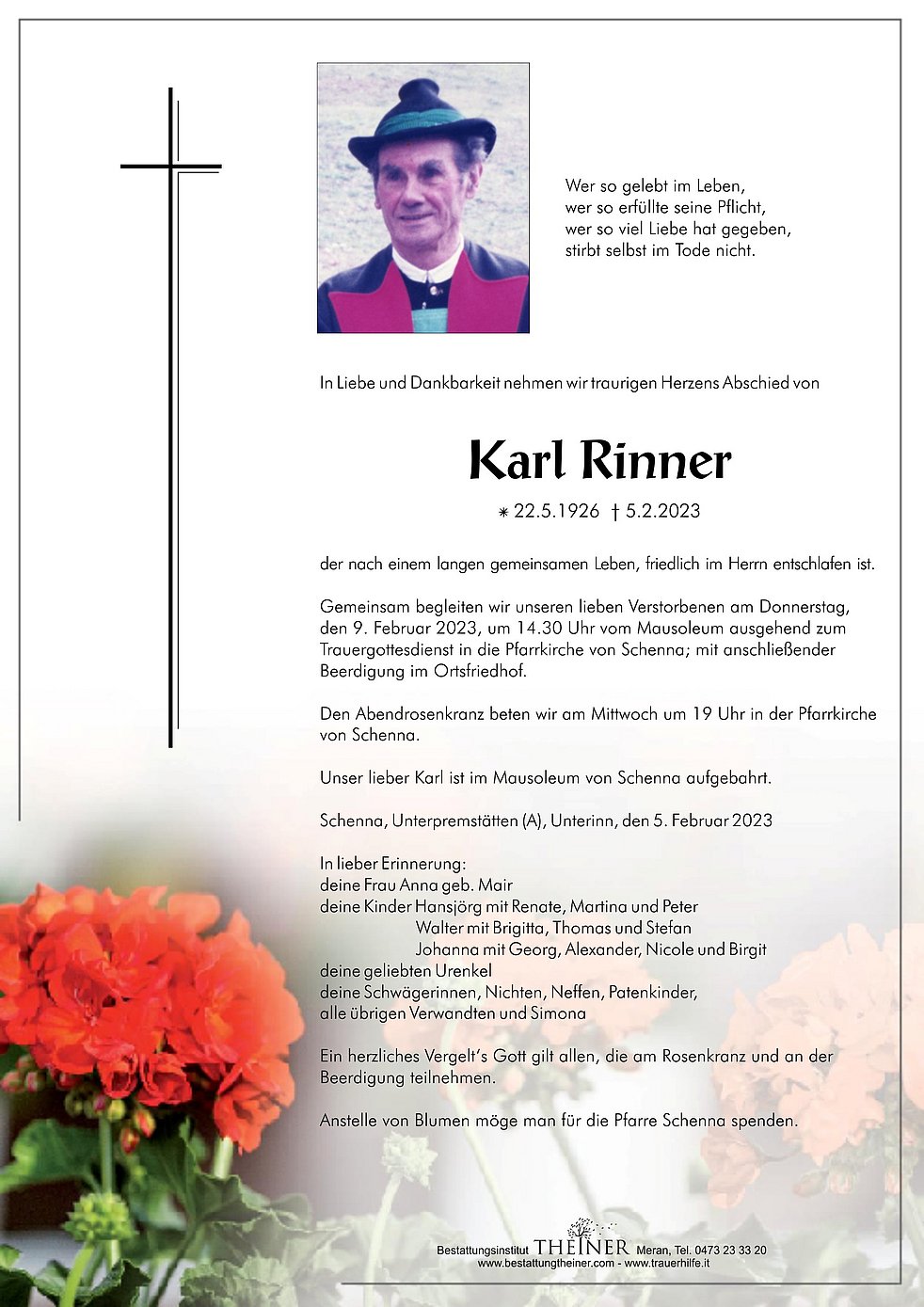 Anstelle von Blumen möge man für die Pfarre Schenna spenden.