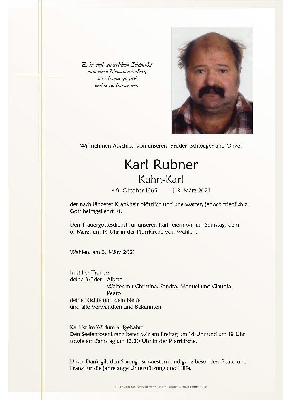 Den Trauergottesdienst für unseren Karl feiern wir am Samstag, dem 6. März, um 14 Uhr in der Pfarrkirche von Wahlen.