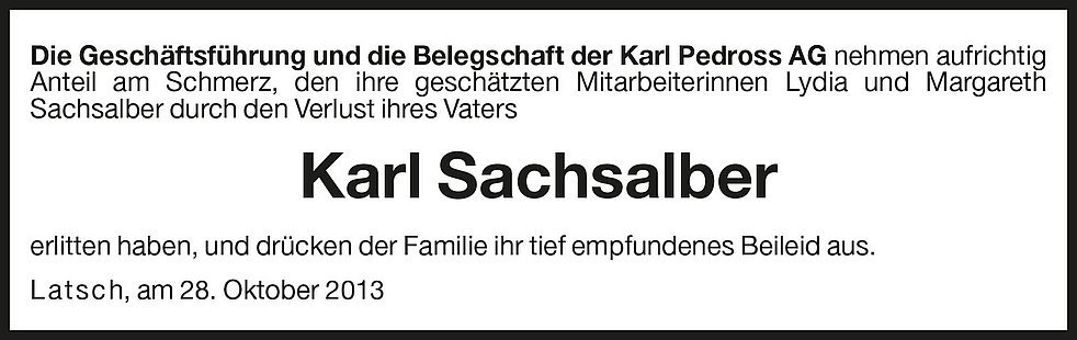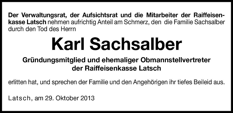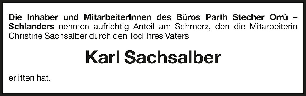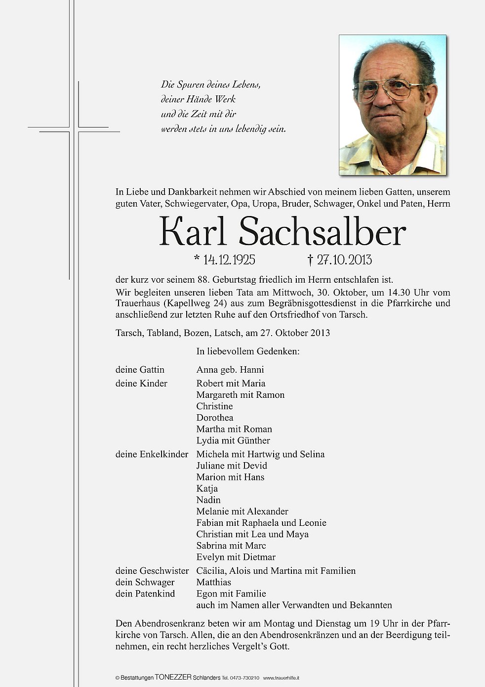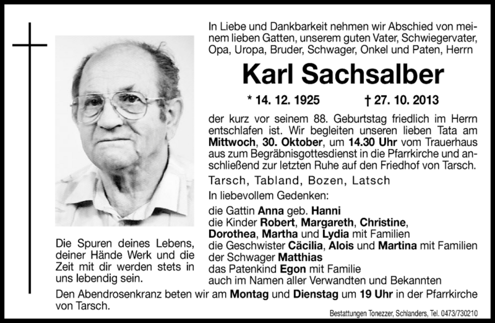 Wir begleiten unseren lieben Tata am Mittwoch, 30. Oktober, um 14.30 Uhr vom Trauerhaus (Kapellweg 24) aus zum Begräbnisgottesdienst in die Pfarrkirche und anschließend zur letzten Ruhe auf den Ortsfriedhof von Tarsch.
