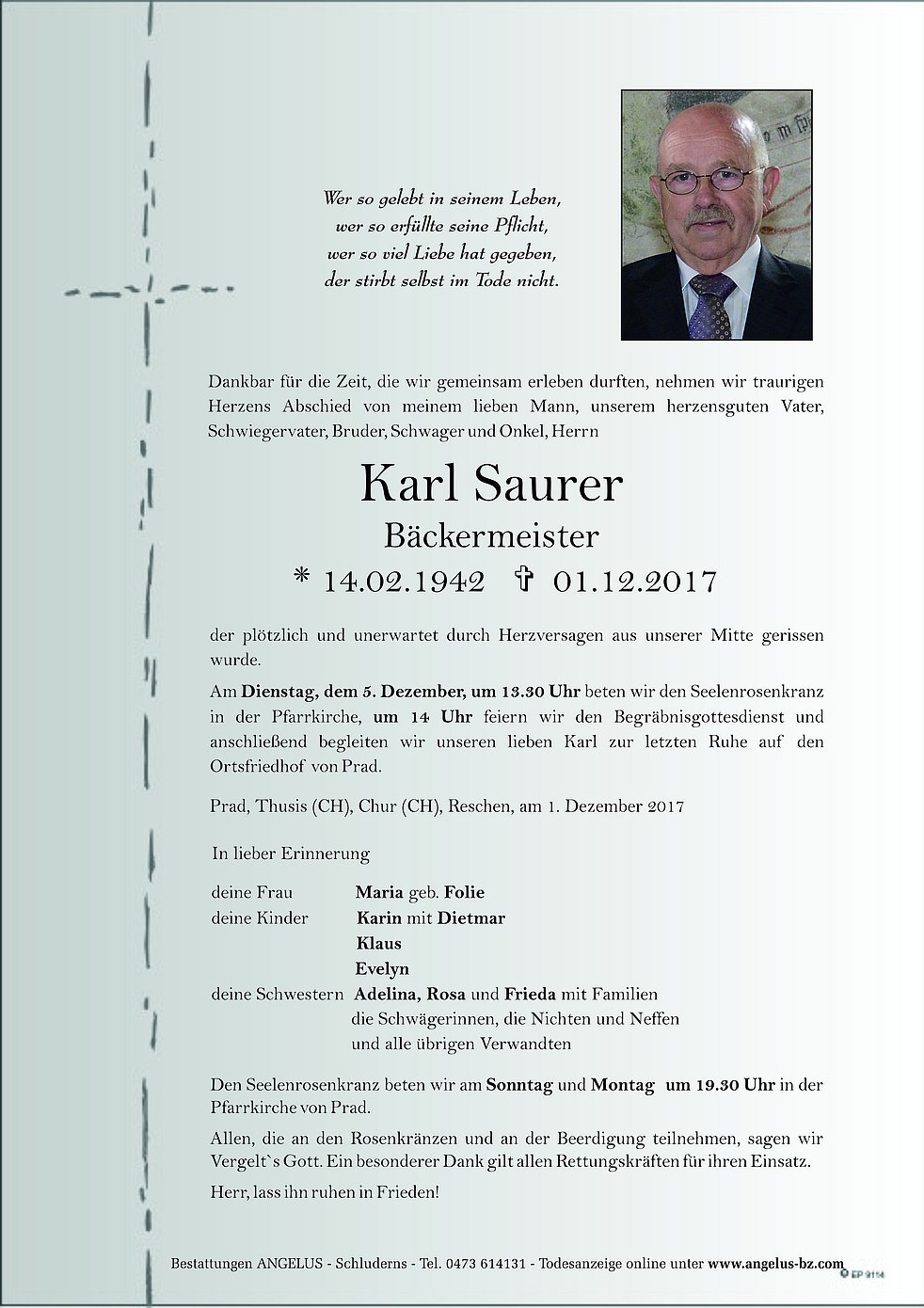 Am Dienstag, dem 5. Dezember, um 13.30 Uhr beten wir den Seelenrosenkranz in der Pfarrkirche, um 14 Uhr feiern wir den Begräbnisgottesdienst und anschließend begleiten wir unseren lieben Karl zur letzten Ruhe auf den Ortsfriedhof von Prad.