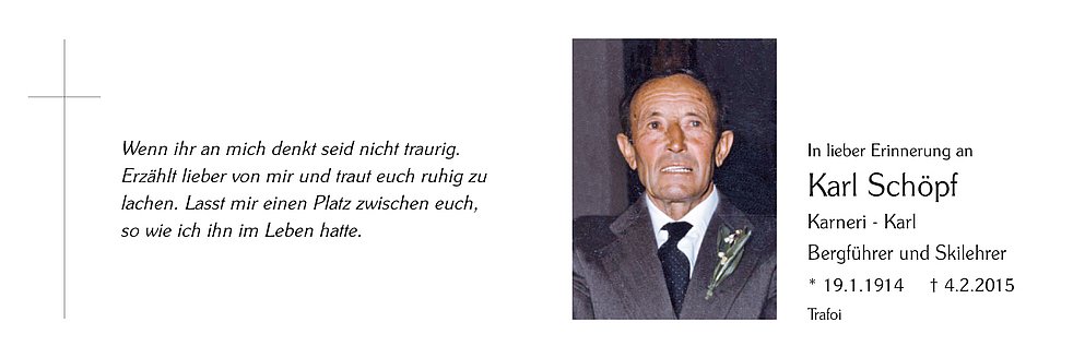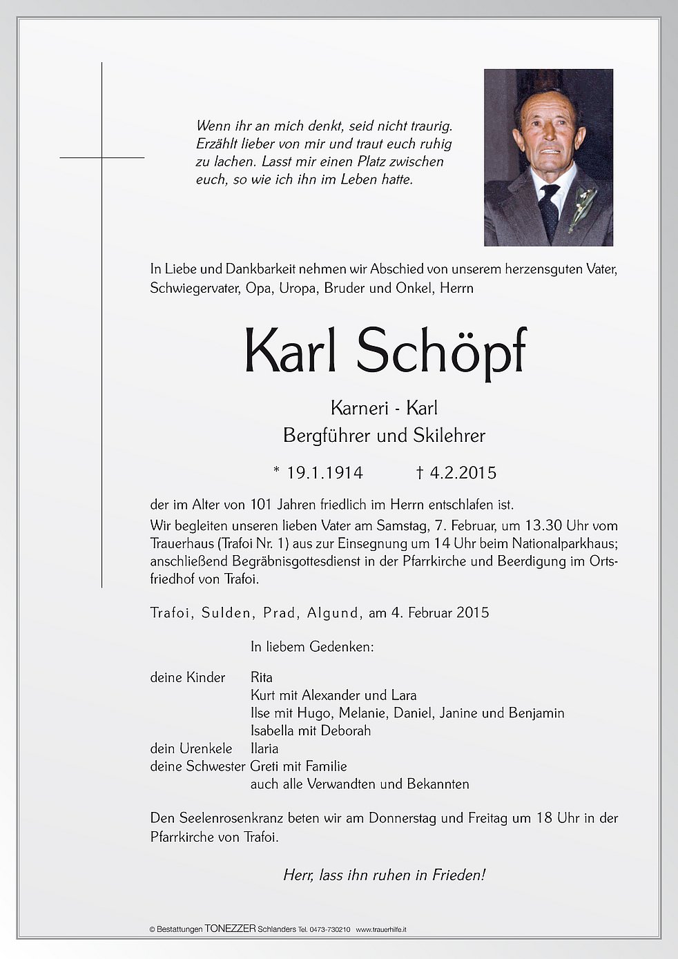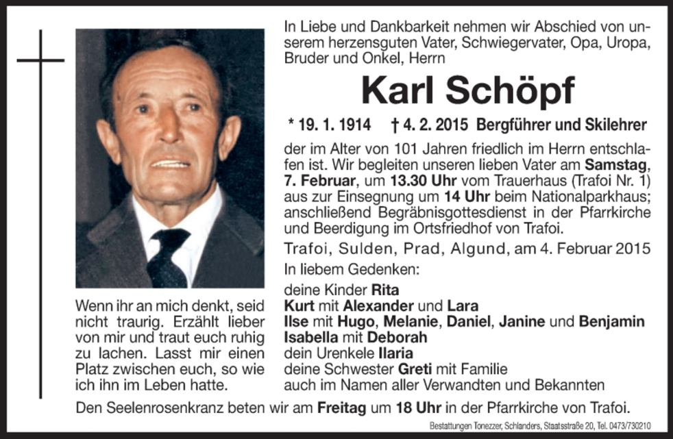 Wir begleiten unseren lieben Vater am Samstag, 7. Februar, um 13.30 Uhr vom Trauerhaus (Trafoi Nr. 1) aus zur Einsegnung um 14 Uhr beim Nationalparkhaus; anschließend Begräbnisgottesdienst in der Pfarrkirche und Beerdigung im Ortsfriedhof von Trafoi.