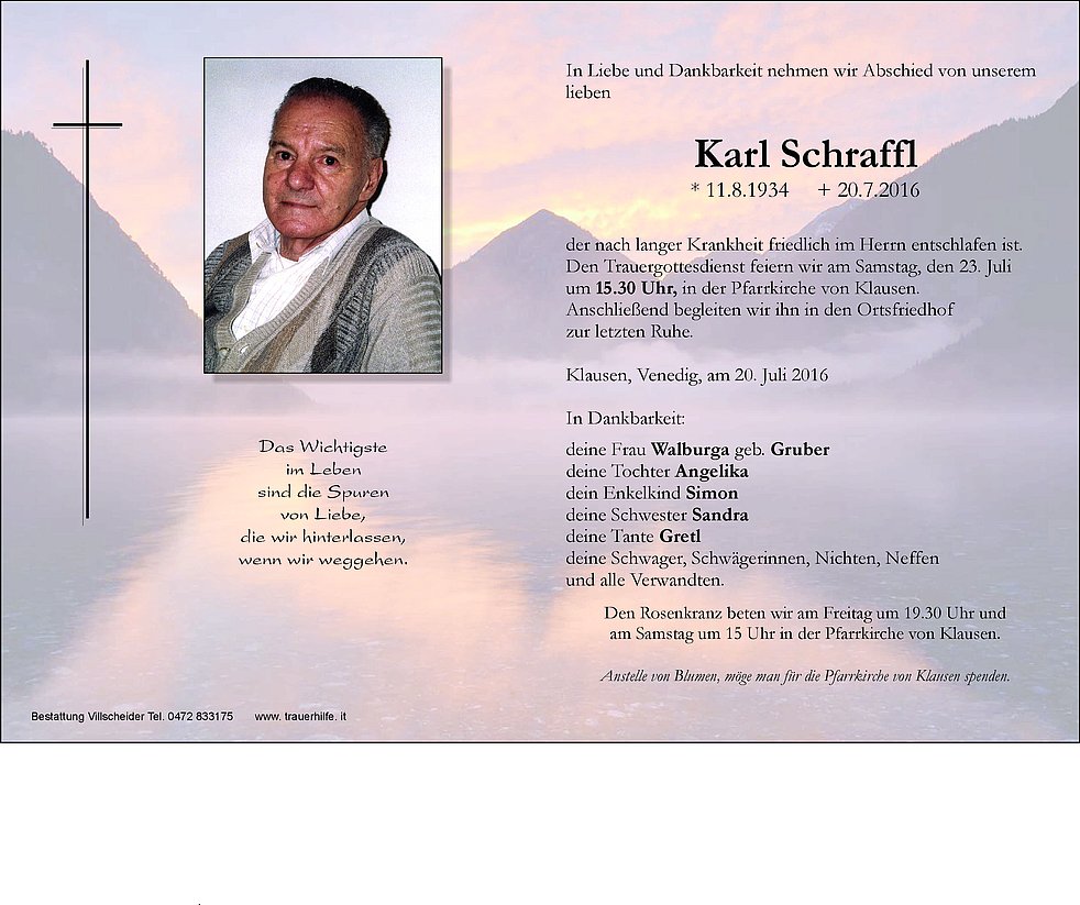 Anstelle von Blumen, möge man für die Pfarrkirche von Klausen spenden.