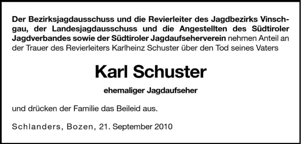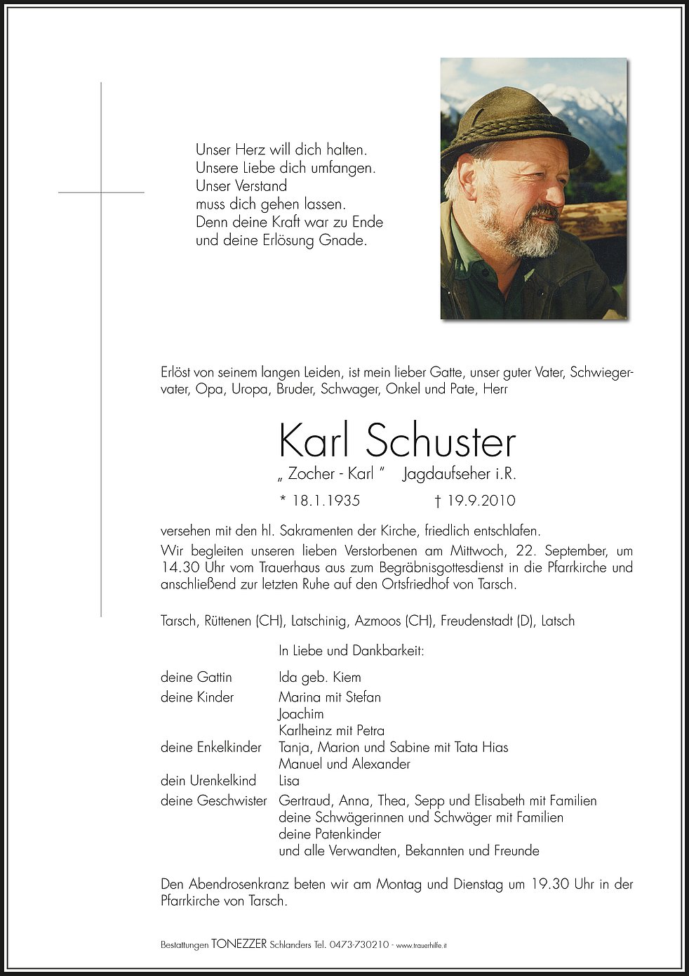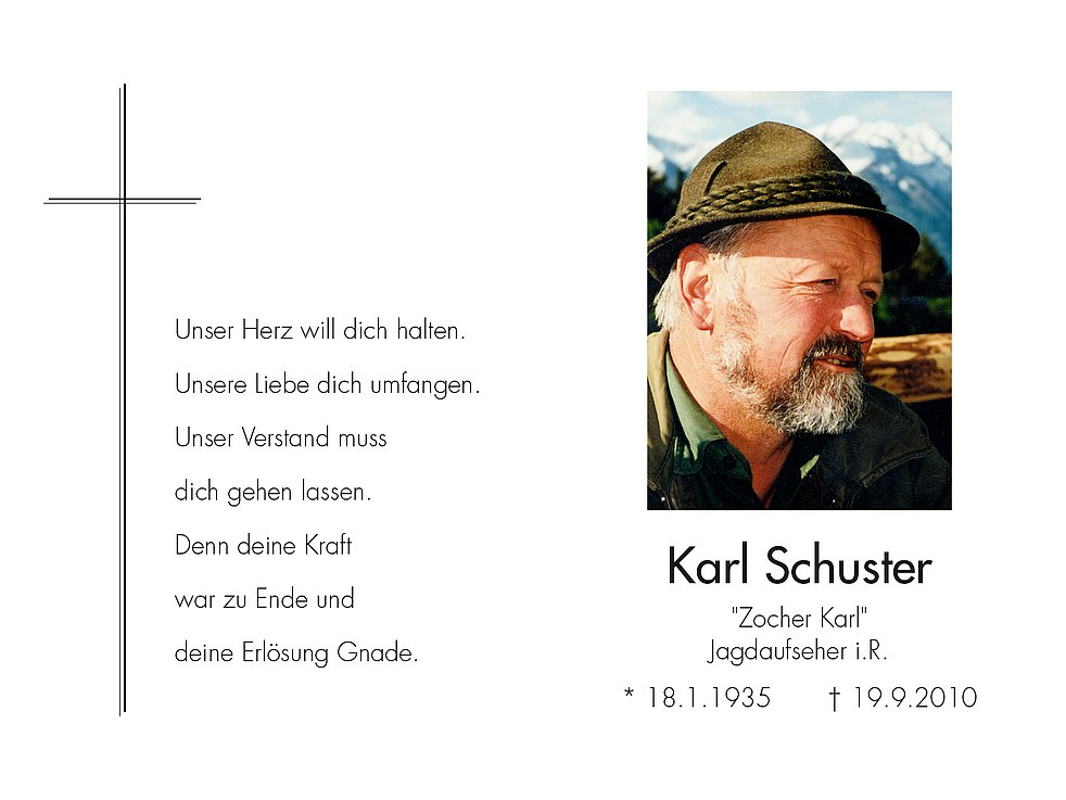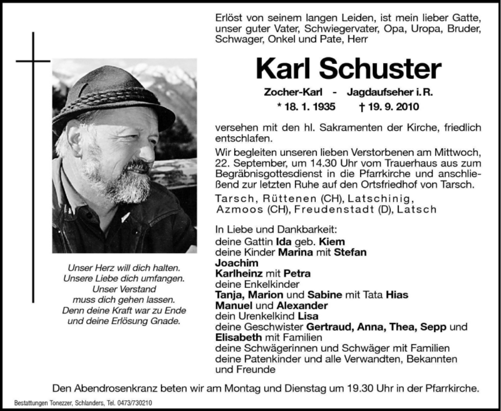 Wir begleiten unseren lieben Verstorbenen am Mittwoch, 22. September, um 14.30 Uhr vom Trauerhaus aus zum Begräbnisgottesdienst in die Pfarrkirche und anschließend zur letzten Ruhe auf den Ortsfriedhof von Tarsch.