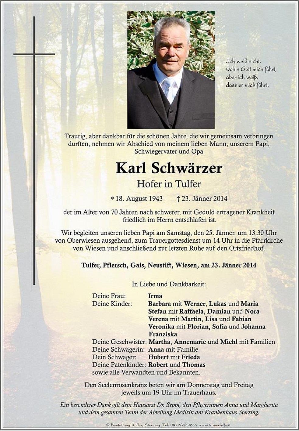 Wir begleiten unseren lieben Papi am Samstag, den 25. Jänner, um 13.30 Uhr von Oberwiesen ausgehend, zum Trauergottesdienst um 14 Uhr in die Pfarrkirche von Wiesen und anschließend zur letzten Ruhe auf den Ortsfriedhof.
