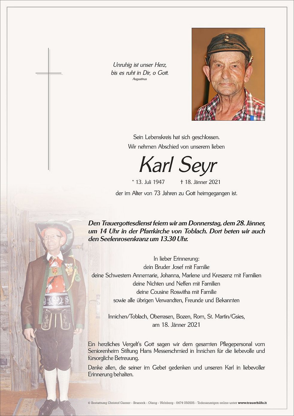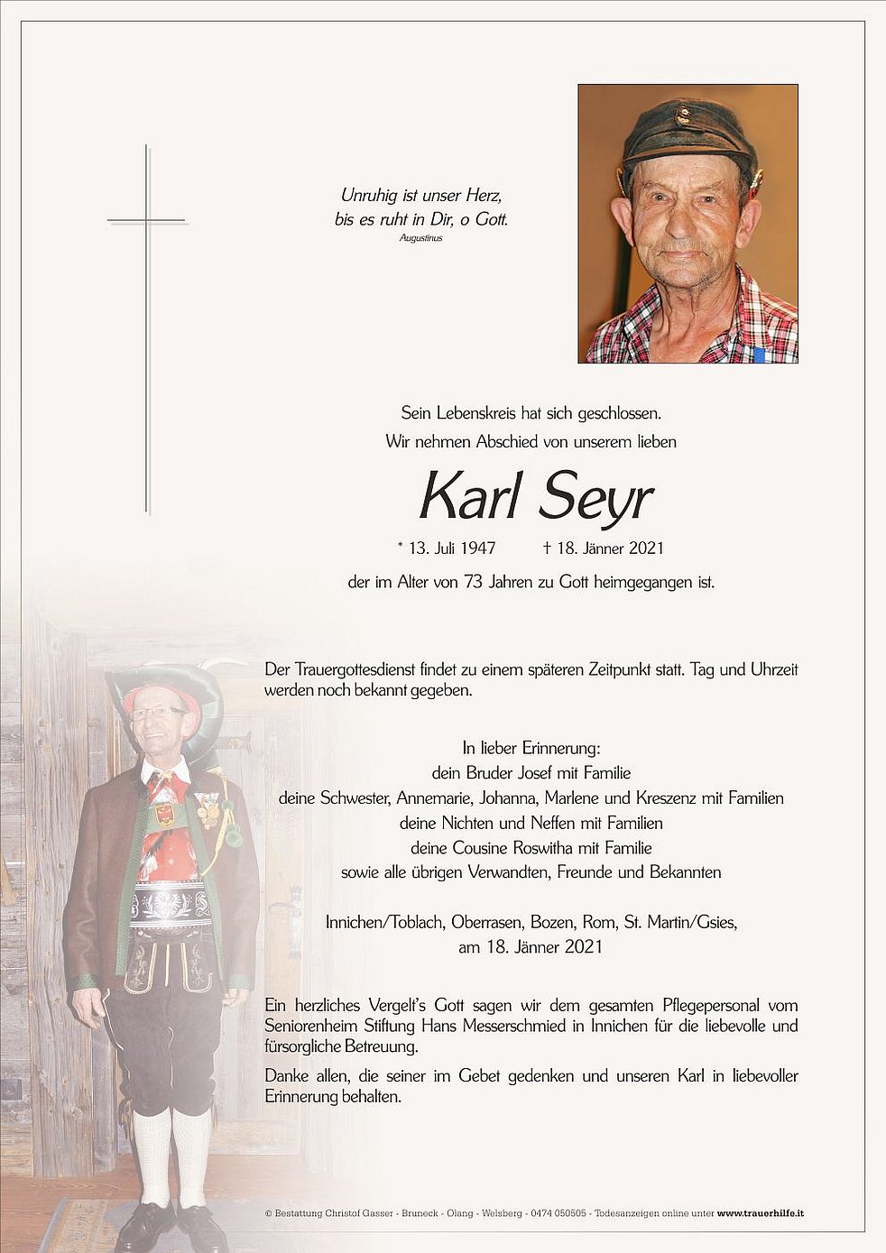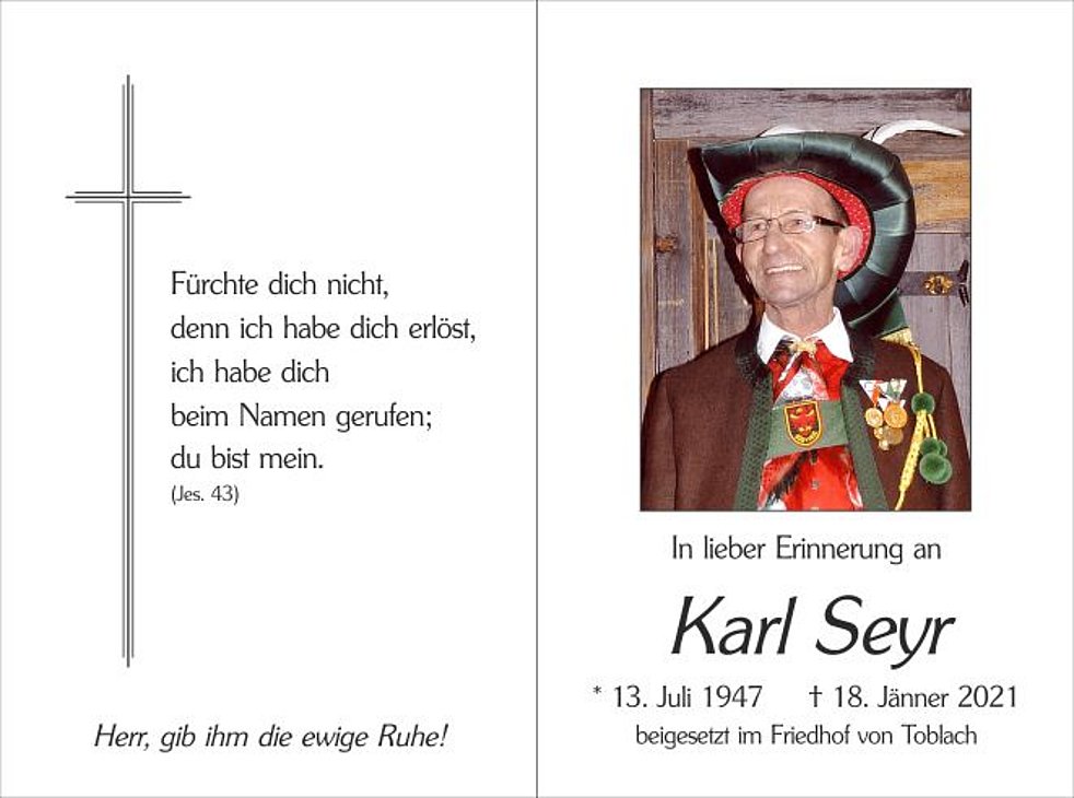 Den Trauergottesdienst feiern wir am Donnerstag, dem 28. Jänner, um 14 Uhr in der Pfarrkirche von Toblach. Dort beten wir auch den Seelenrosenkranz um 13.30 Uhr.