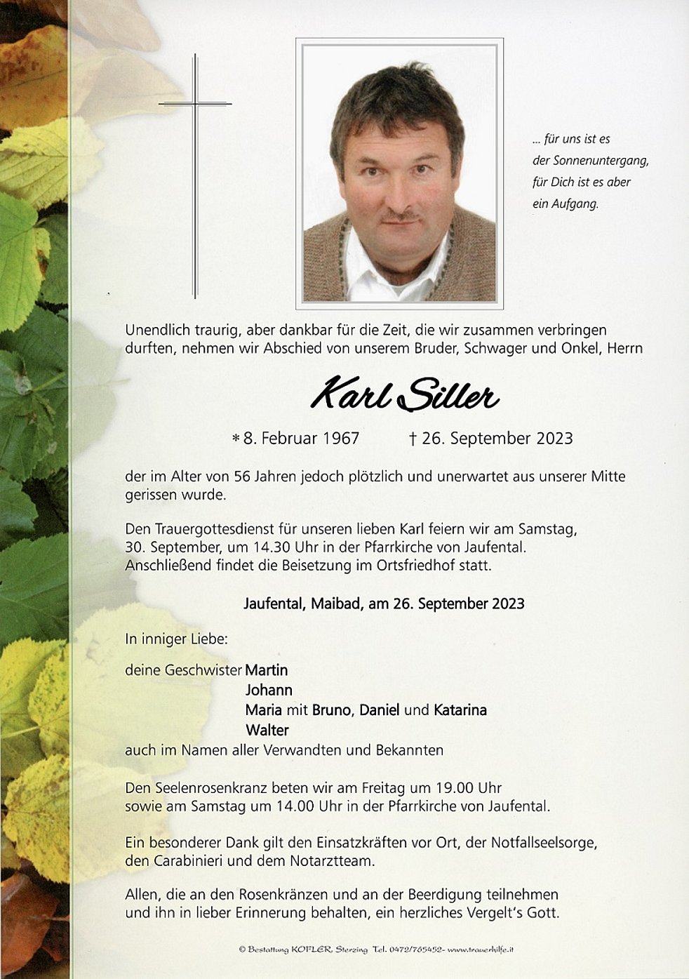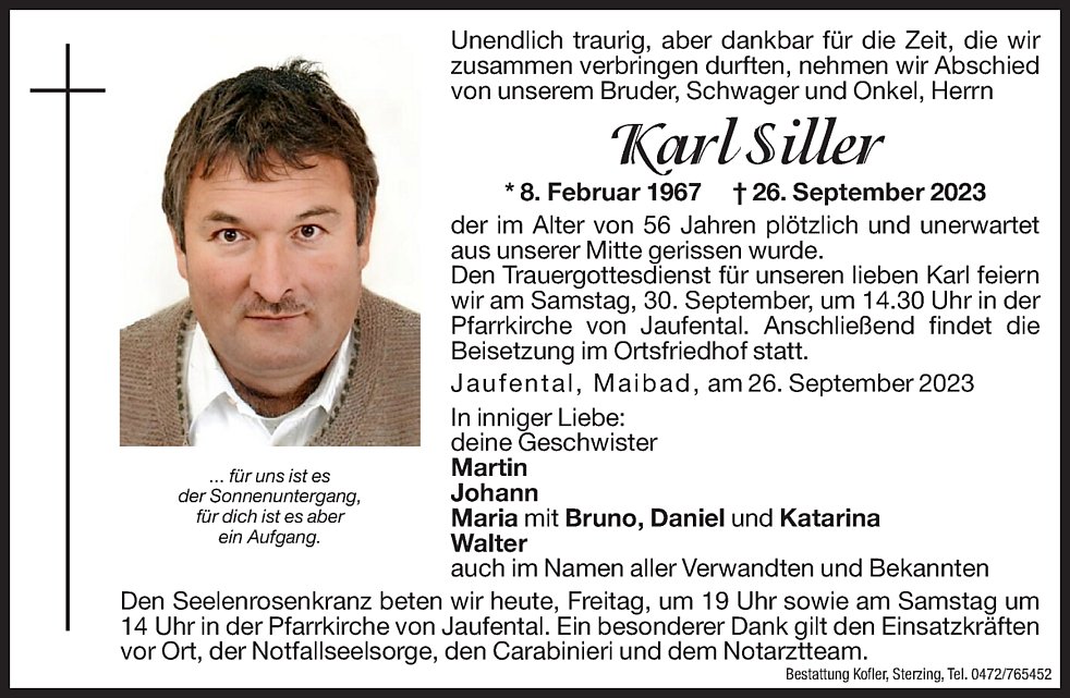 Den Trauergottesdienst für unseren lieben Karl feiern wir am Samstag, 30. September, um 14.30 Uhr in der Pfarrkirche von Jaufental. Anschließend findet die Beisetzung im Ortsfriedhof statt.
