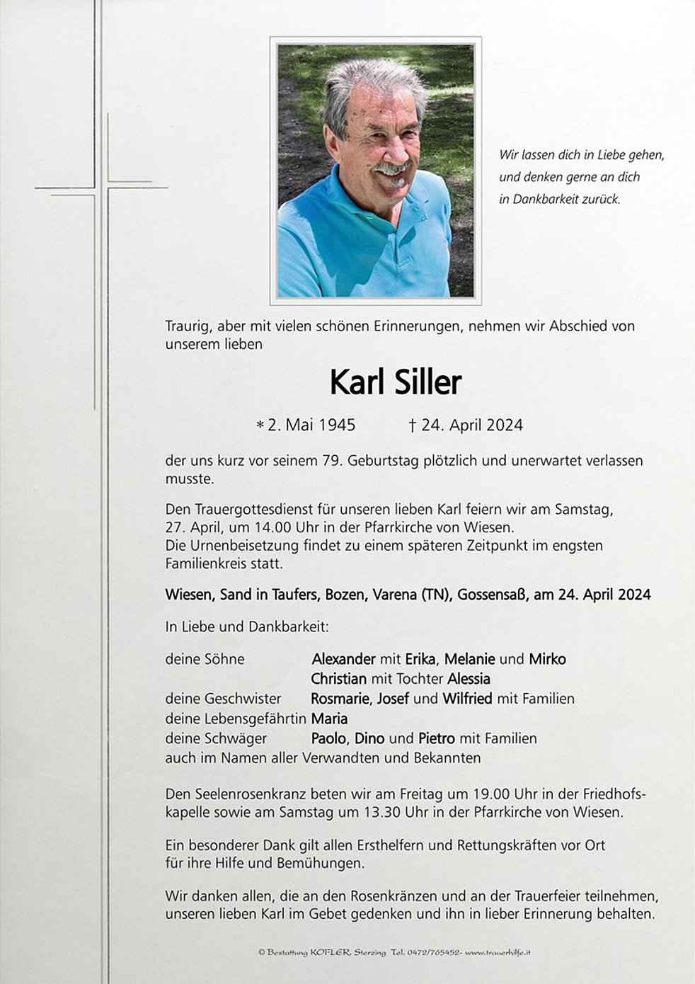 Den Trauergottesdienst für unseren lieben Karl feiern wir am Samstag, 27. April, um 14.00 Uhr in der Pfarrkirche von Wiesen. Die Urnenbeisetzung findet zu einem späteren Zeitpunkt im engsten Familienkreis statt.