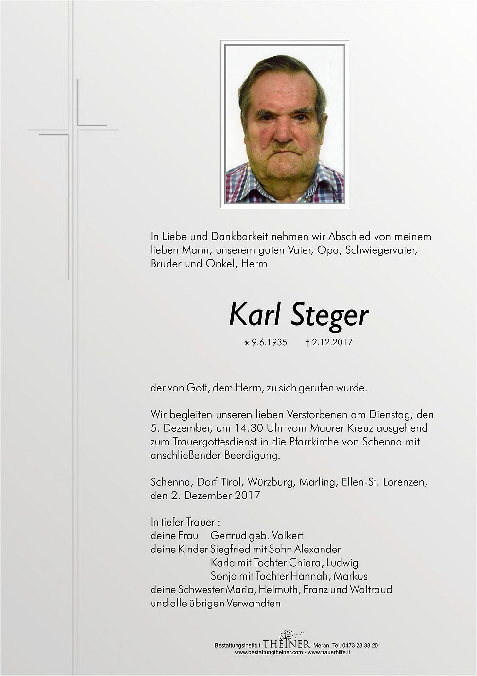 Wir begleiten unseren lieben Verstorbenen am Dienstag, den 5. Dezember, um 14.30 Uhr vom Maurer Kreuz ausgehend zum Trauergottesdienst in die Pfarrkirche von Schenna mit anschließender Beerdigung.