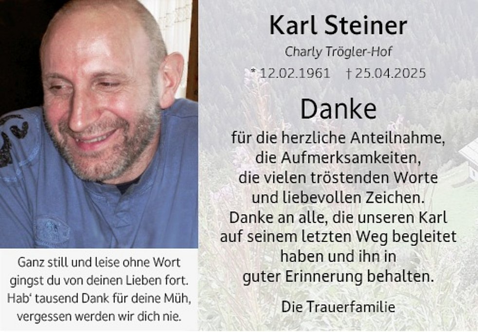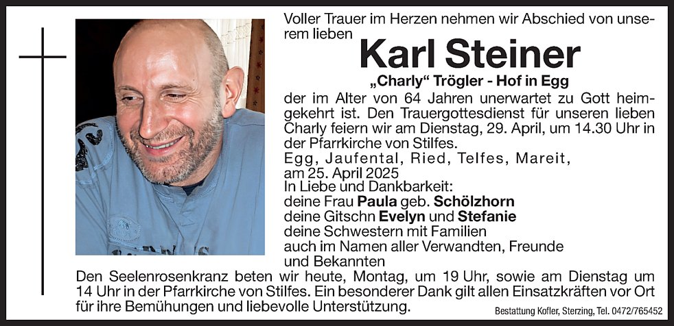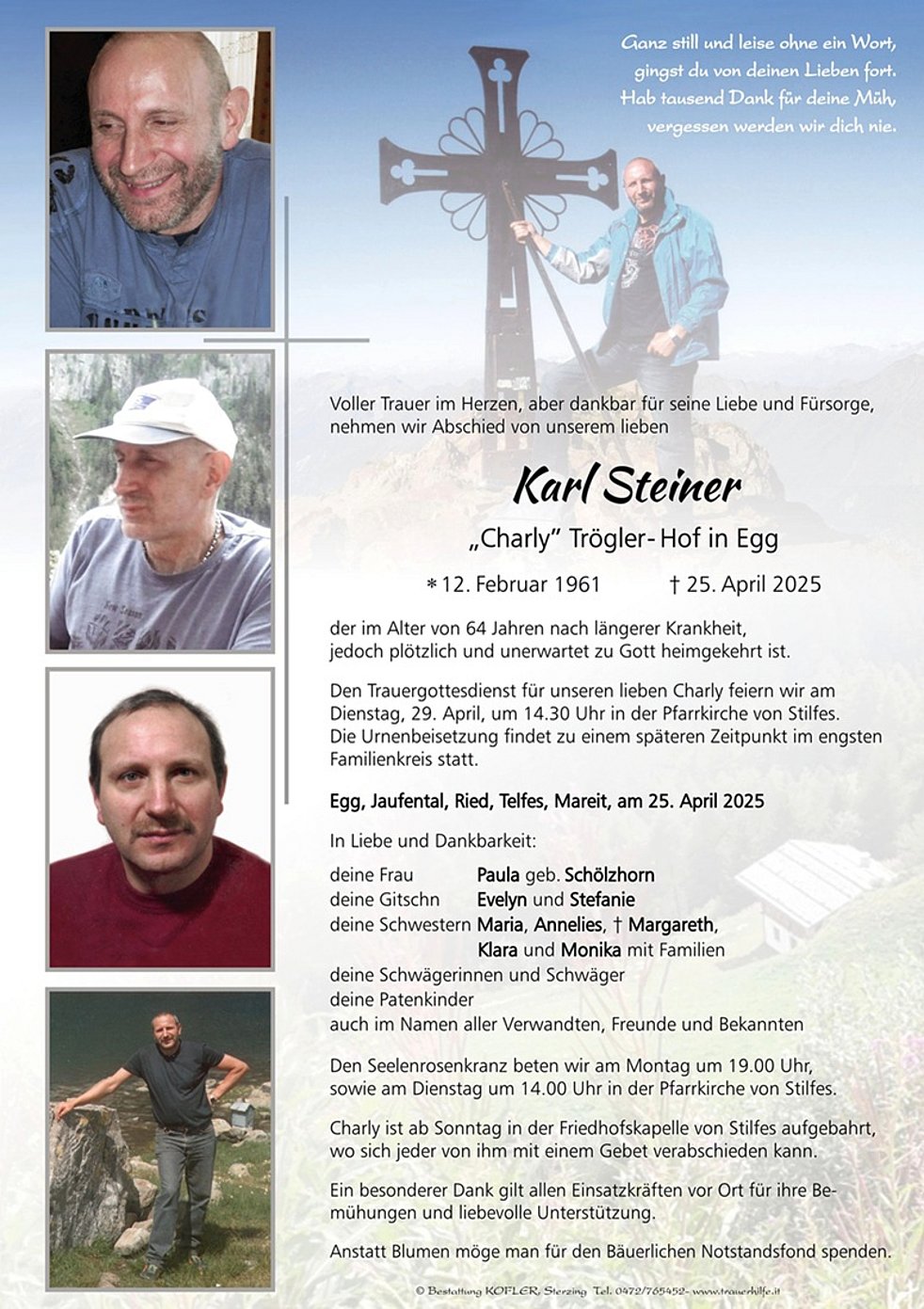 Den Trauergottesdienst für unseren lieben Charly feiern wir am Dienstag, 29. April, um 14.30 Uhr in der Pfarrkirche von Stilfes. Die Urnenbeisetzung findet zu einem späteren Zeitpunkt im engsten Familienkreis statt.