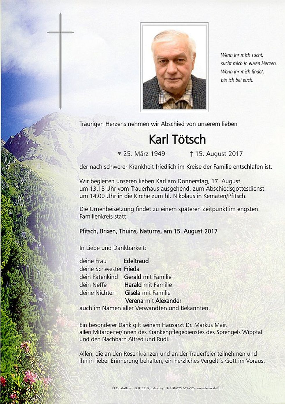 Wir begleiten unseren lieben Karl am Donnerstag, 17. August, um 13.15 Uhr vom Trauerhaus ausgehend, zum Abschiedsgottesdienst um 14.00 Uhr in die Kirche zum hl. Nikolaus in Kematen/Pfitsch.