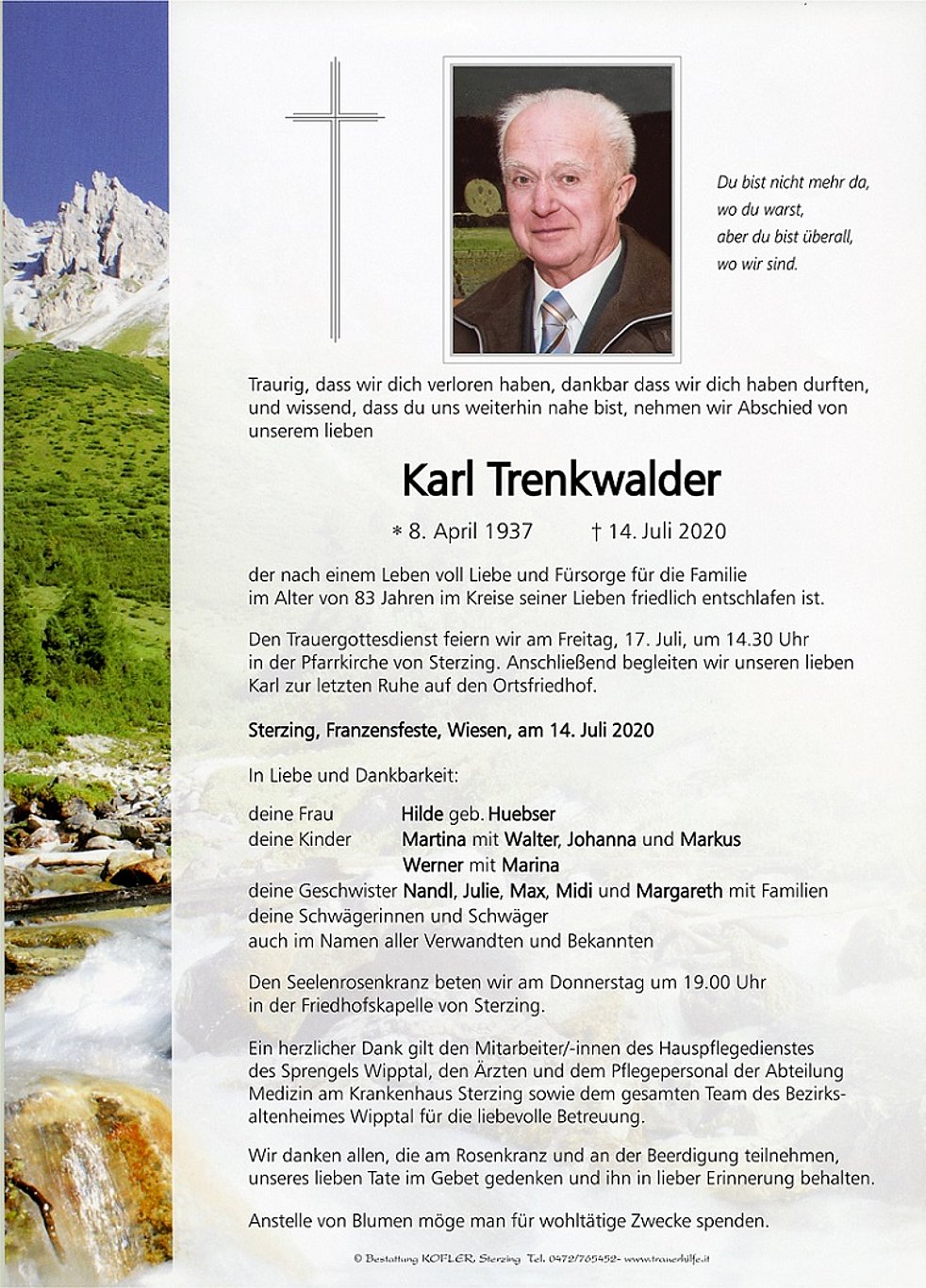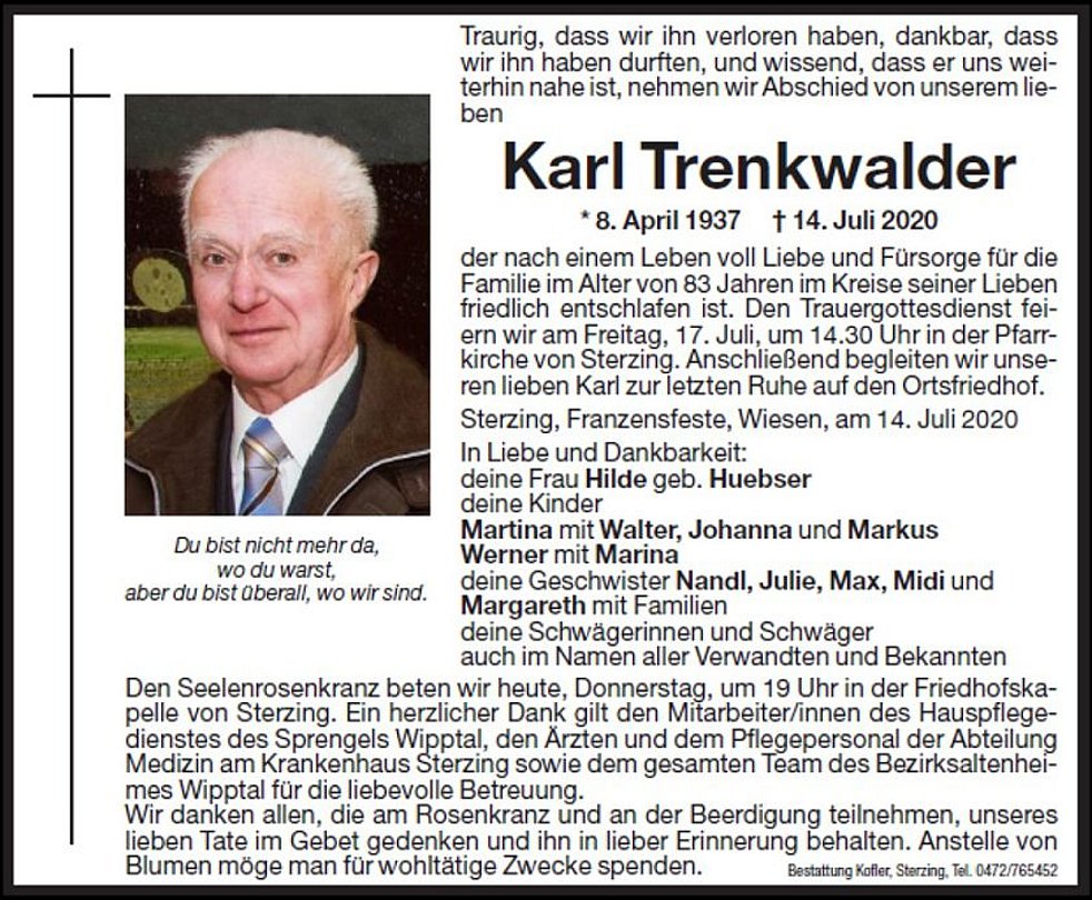 Den Trauergottesdienst feiern wir am Freitag, 17. Juli, um 14.30 Uhr in der Pfarrkirche von Sterzing. Anschließend begleiten wir unseren lieben Karl zur letzten Ruhe auf den Ortsfriedhof.