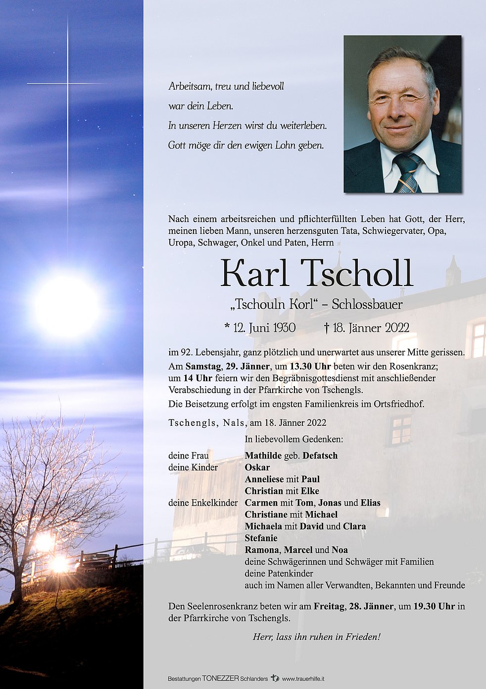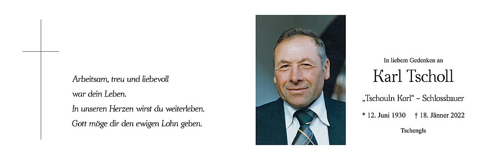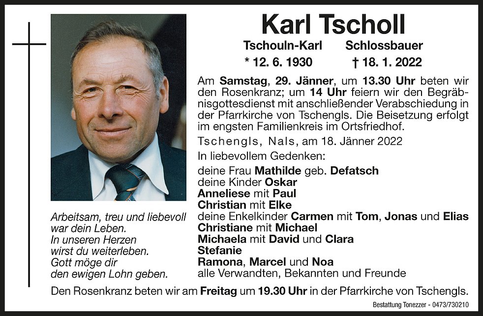 Am Samstag, 29. Jänner, um 13.30 Uhr beten wir den Rosenkranz; um 14 Uhr feiern wir den Begräbnisgottesdienst mit anschließender Verabschiedung in der Pfarrkirche von Tschengls.