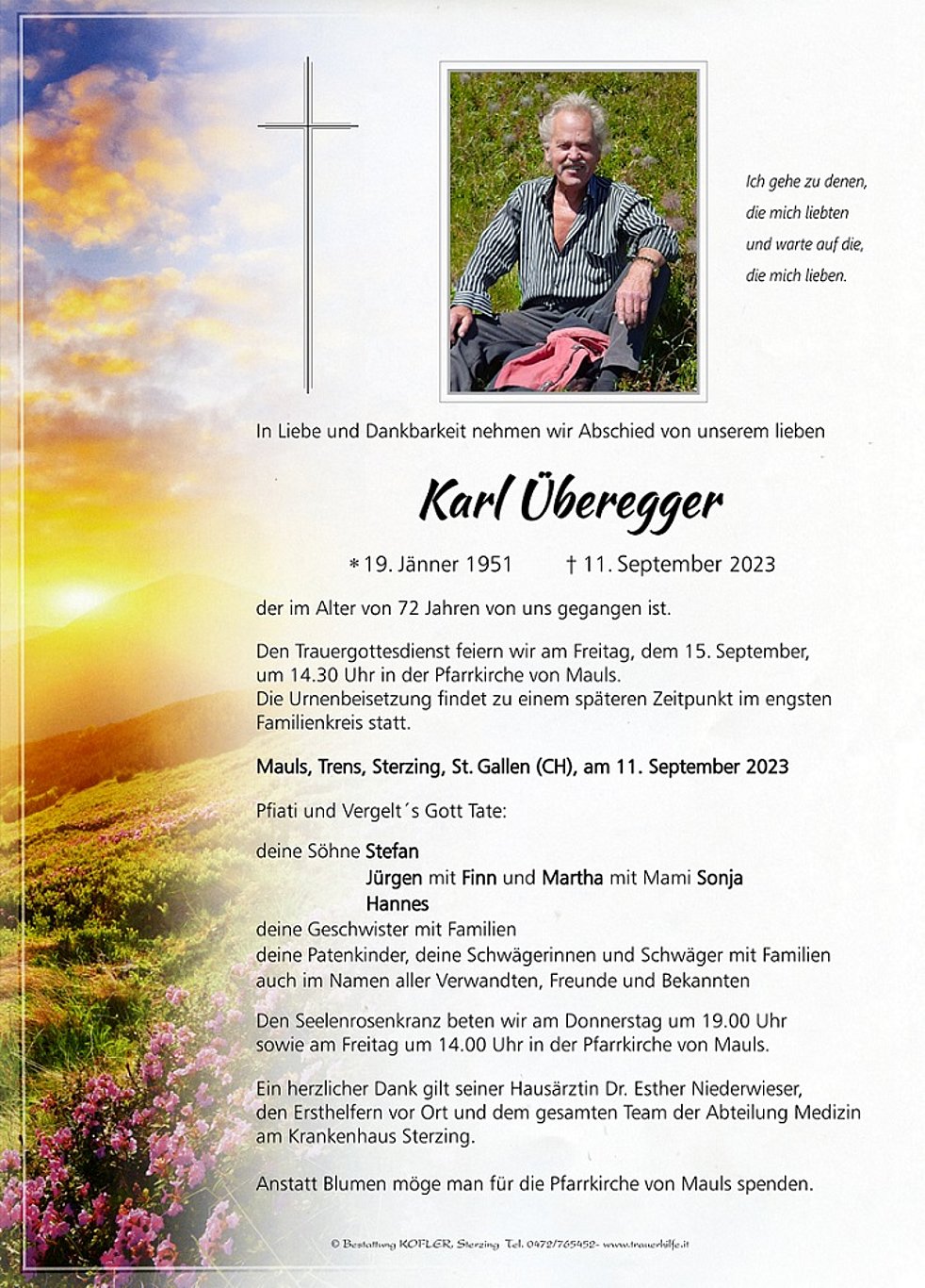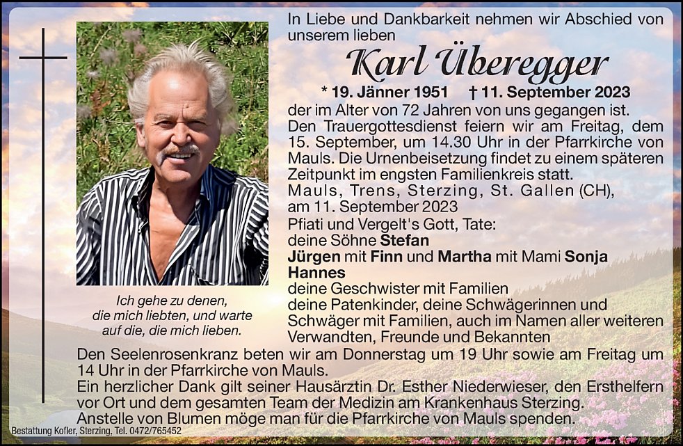Den Trauergottesdienst feiern wir am Freitag, dem 15. September, um 14.30 Uhr in der Pfarrkirche von Mauls. Die Urnenbeisetzung findet zu einem späteren Zeitpunkt im engsten Familienkreis statt.