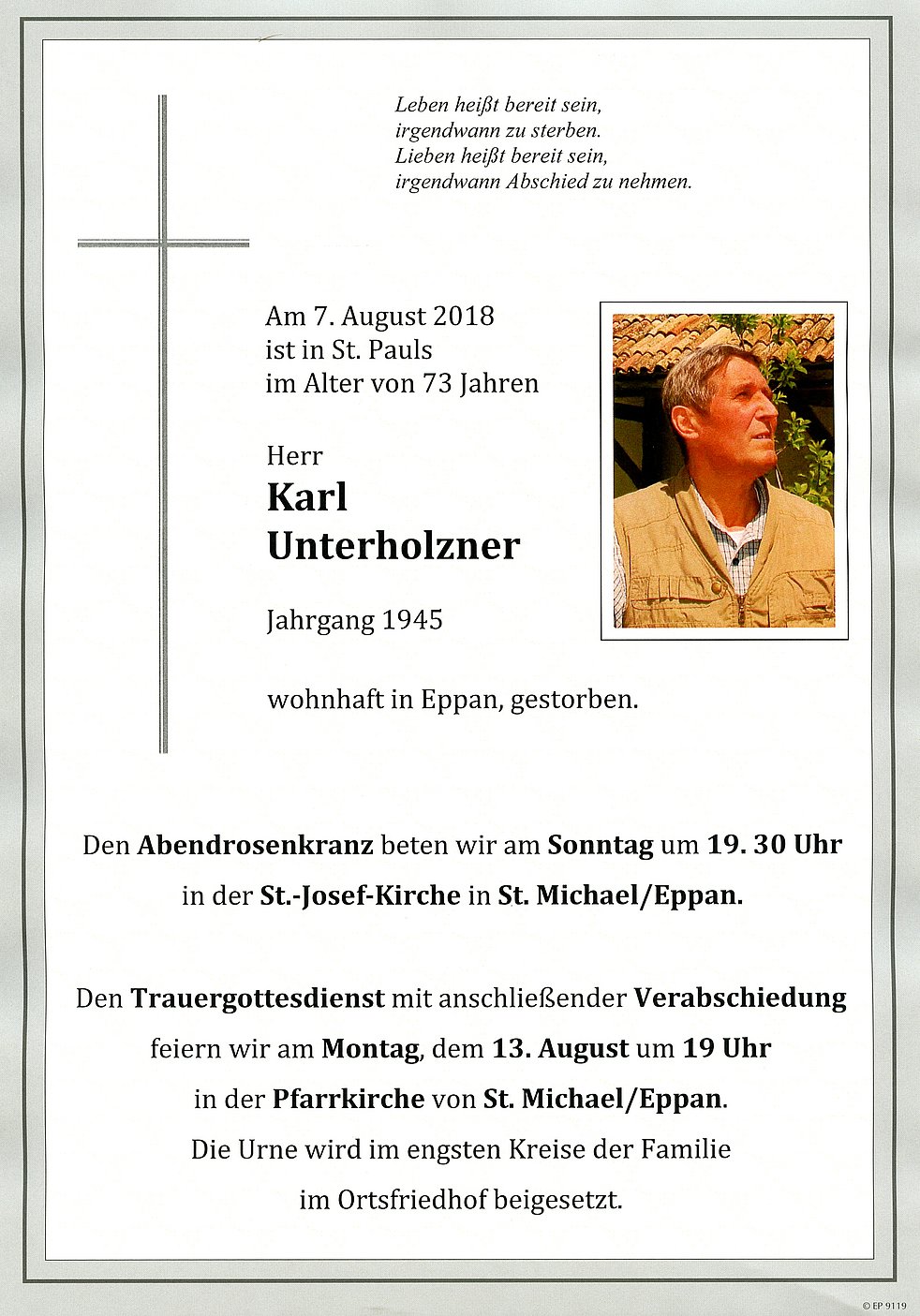 Trauerfeier: 13.08. - 19:00 Uhr Pfarrkirche St. Michael/Eppan