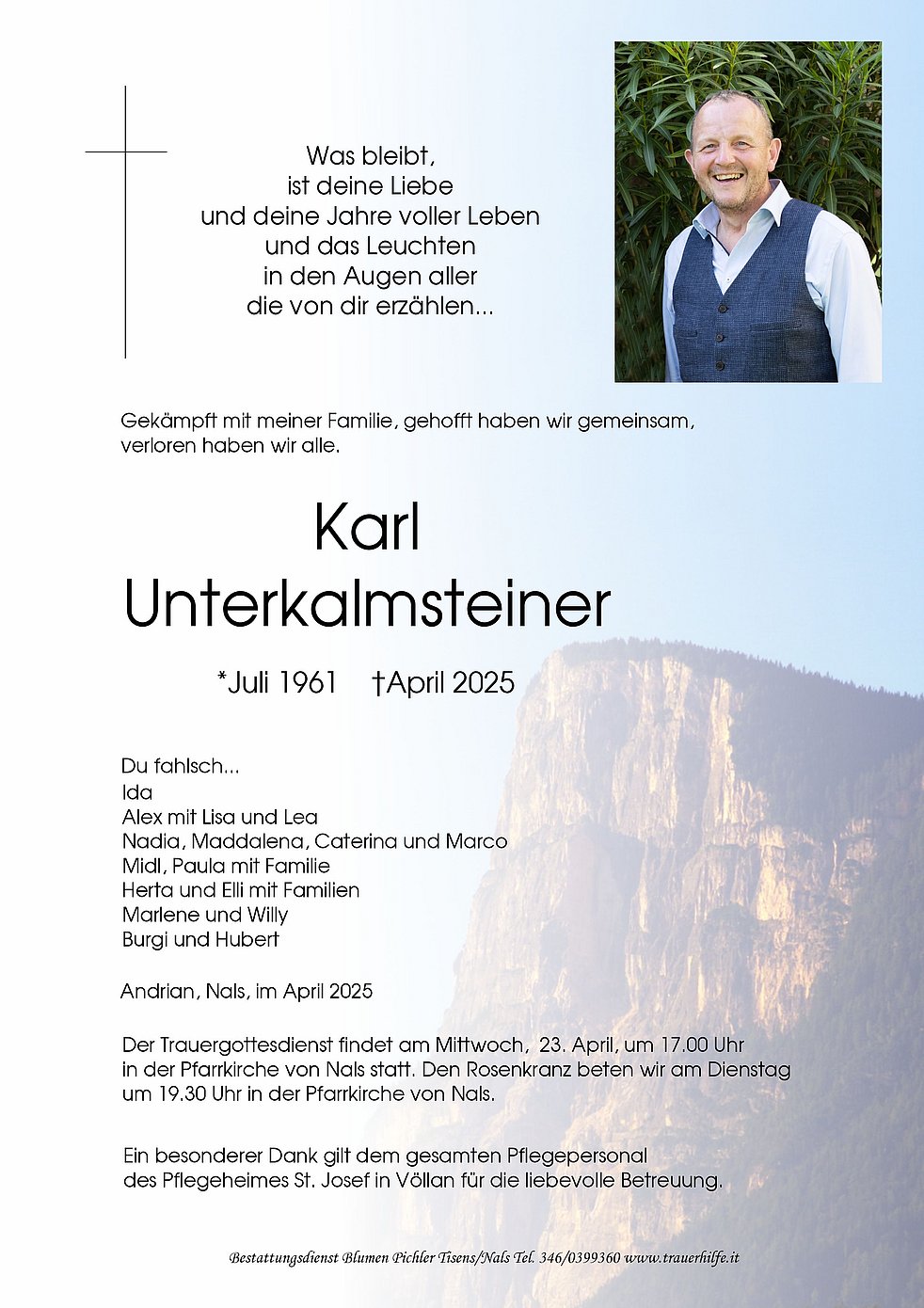 Liebe Elli & Ruth, es ist schwer die richtigen Worte zu finden, denn jedes Wort erscheint zu viel und doch zu wenig. Wir wünschen besonders dir liebe Elli gute Gedanken und schöne Erinnerungen an die gemeinsame Zeit mit deinem Bonus Papi . Ich weiß, gerade jetzt in deiner Trauer ist es dir kein Trost aber die wunderbaren Momente eures Lebens und die Liebe zwischen euch kann euch keiner mehr nehmen. Karl wird immer in deinem Herzen sein, und auch wenn es im Moment noch unvorstellbar scheint, wirst du irgendwann mit einem Lächeln an ihn denken und einfach nur Dankbarkeit empfinden für all das was war Wir sind für euch da, unser herzlichstes Mitgefühl