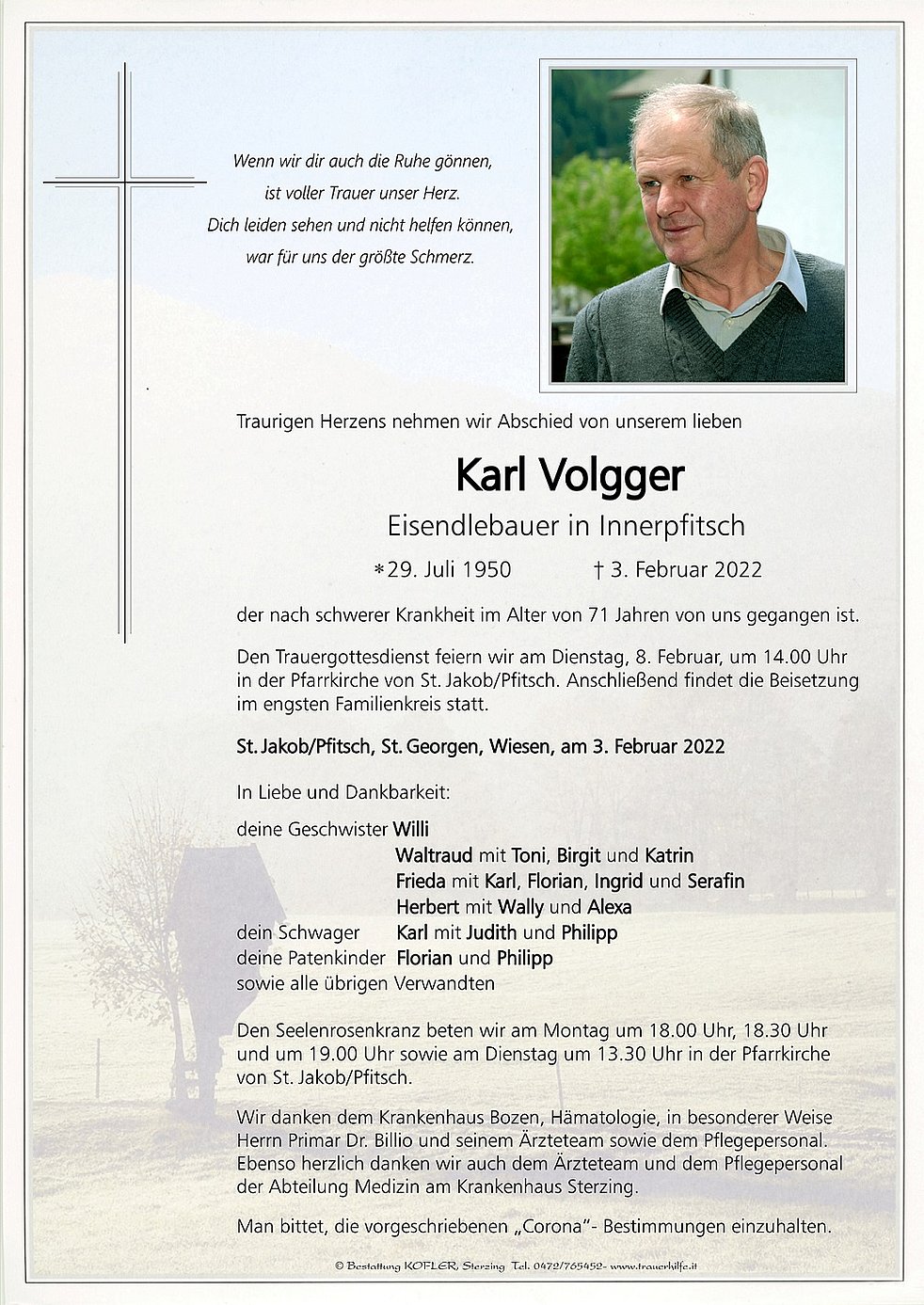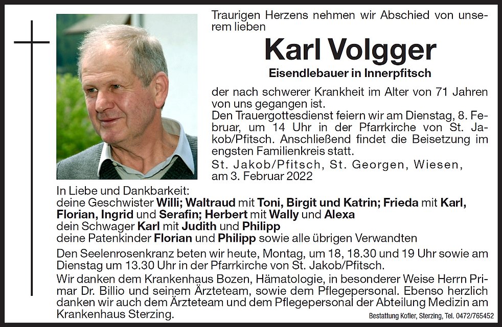 Den Trauergottesdienst feiern wir am Dienstag, 8. Februar, um 14.00 Uhr in der Pfarrkirche von St. Jakob/Pfitsch. Anschließend findet die Beisetzung im engsten Familienkreis statt.