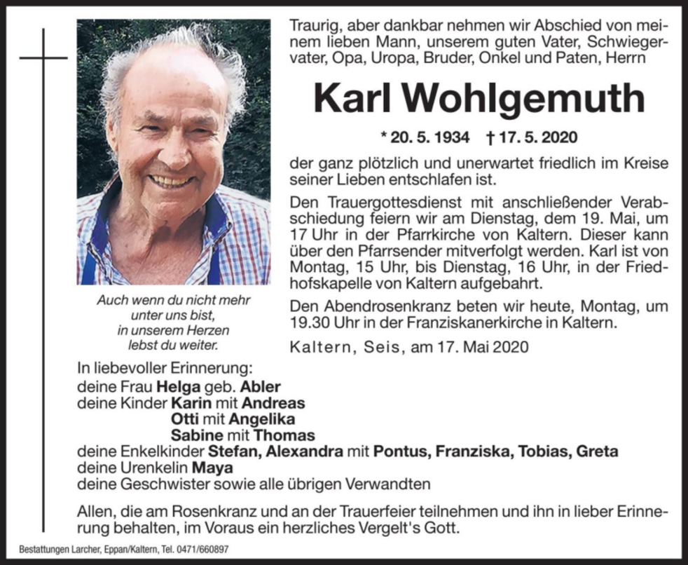 Den Trauergottesdienst mit anschließender Verabschiedung feiern wir am Dienstag, dem 19. Mai um 17 Uhr in der Pfarrkirche von Kaltern und kann über den Pfarrsender mitverfolgt werden.