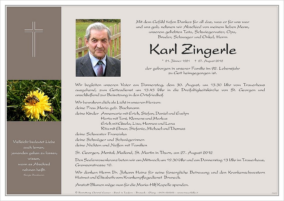Wir begleiten unseren Vater am Donnerstag, dem 30. August, um 13.30 Uhr vom Trauerhaus ausgehend, zum Gottesdienst um 13.45 Uhr in die Dreifaltigkeitskirche von St. Georgen und anschließend zur Beisetzung in den Ortsfriedhof.