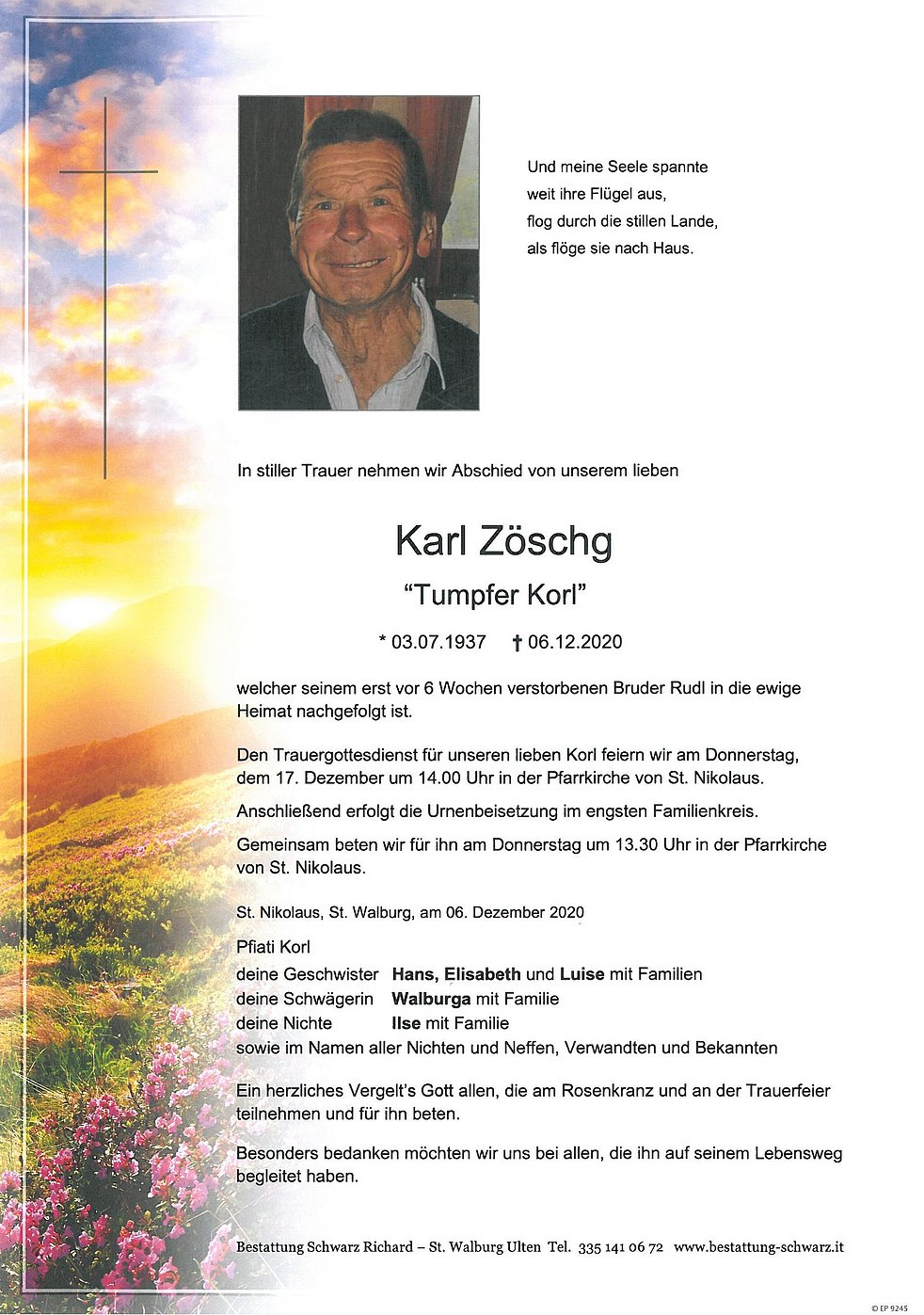 Ein herzliches Vergelt’s Gott allen, die am Rosenkranz und an der Trauerfeier teilnehmen und für ihn beten.
