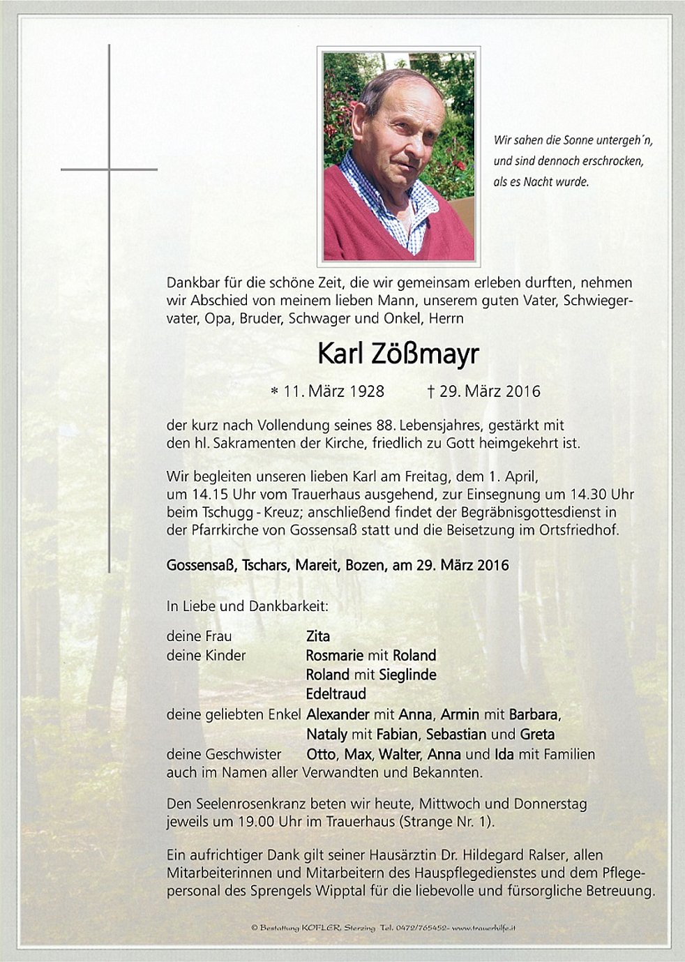 Wir begleiten unseren lieben Karl am Freitag, dem 1. April, um 14.15 Uhr vom Trauerhaus ausgehend, zur Einsegnung um 14.30 Uhr beim Tschugg- Kreuz; anschließend findet der Begräbnisgottesdienst in der Pfarrkirche von Gossensaß statt und die Beisetzung im Ortsfriedhof.