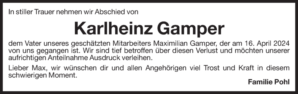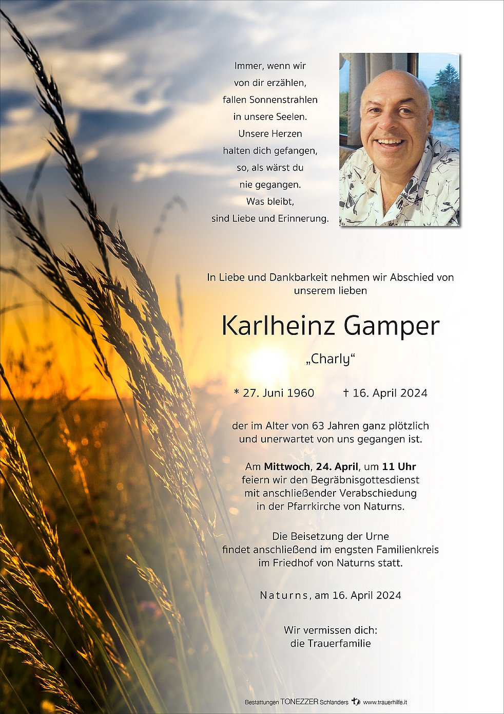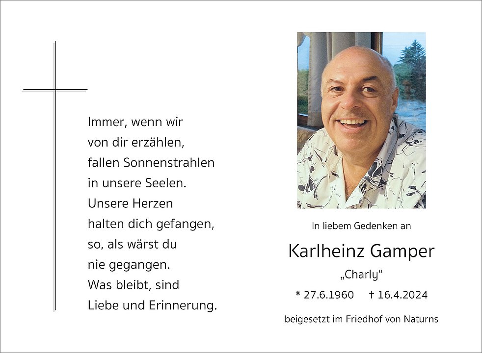Liebe Antonia, liebe Angelika, liebe Carolin und lieber Max und alle Angehörigen. Voller Schock traf uns die Nachricht , als wir vom plötzlichen Tod deines lieben Sohnes, Mannes und eures Vater gehört haben. 60 Jahre verbindet uns mit der Familie Gamper und natürlich auch mit Charly. Vor fast 2 Jahren, haben wir als Familie Konzelmann einen gemeinsamen Urlaub mit allen Geschwistern geplant und dieser Urlaub fiel genau in den Beerdigungszeitraum. Wir sprechen euch uns tiefstest Mitgefühl und Anteilnahme aus. Wir wünschen euch viel Kraft und das ihr euch gemeinsam unterstützt, die anfallenden Aufgaben zu bewältigen.