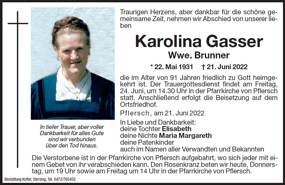 Der Trauergottesdienst findet am Freitag, 24. Juni, um 14.30 Uhr in der Pfarrkirche von Pflersch statt. Anschließend erfolgt die Beisetzung auf dem Ortsfriedhof.