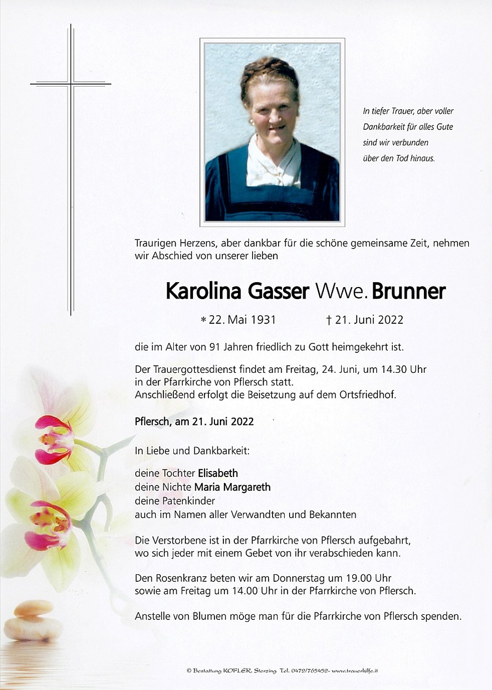 Anstelle von Blumen möge man für die Pfarrkirche von Pflersch spenden.
