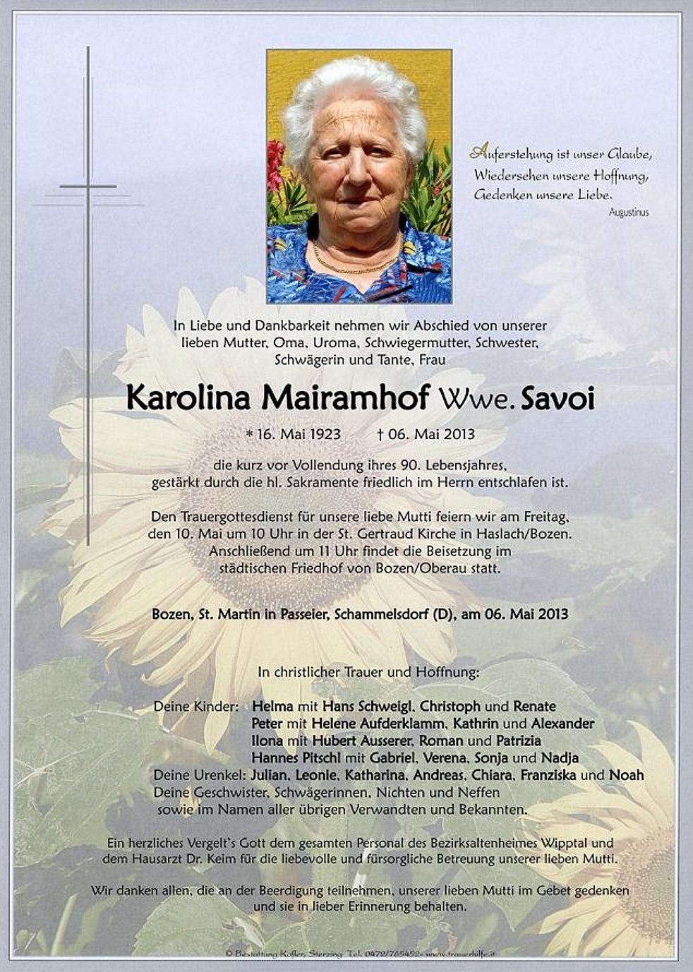 findet die Beisetzung im städtischen Friedhof von Bozen/Oberau statt.