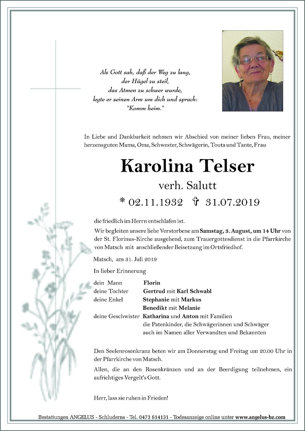 Bestattungen ANGELUS - Schluderns - Tel. 0473 614131 - Todesanzeige online unter www.angelus-bz.com