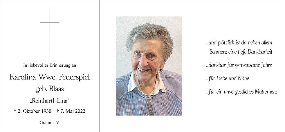 Wir begleiten unsere liebe Mama am Mittwoch, 11. Mai, um 14 Uhr vom Briefträger-Kreuz aus zum Begräbnisgottesdienst in die Pfarrkirche von Graun und anschließend zur letzten Ruhe auf den Ortsfriedhof.