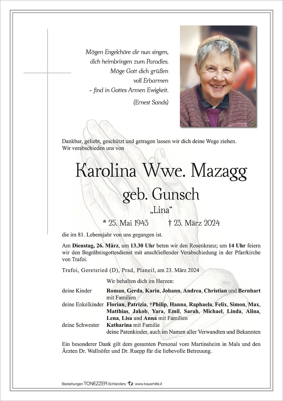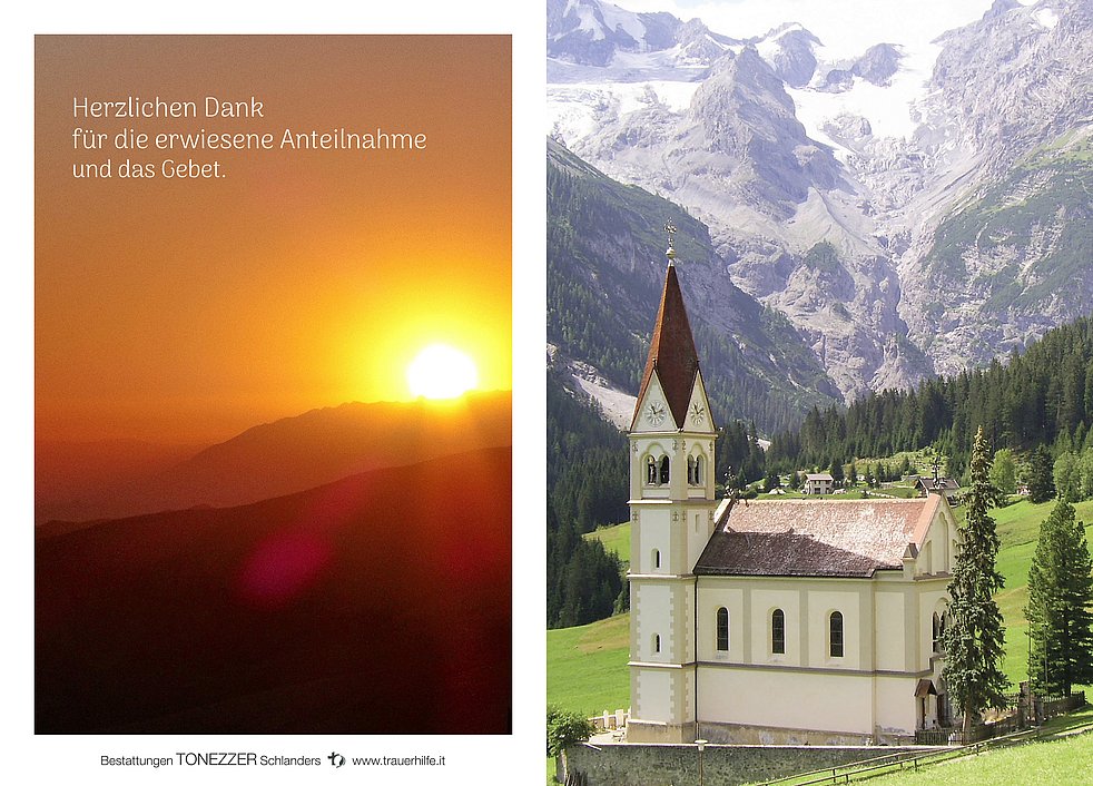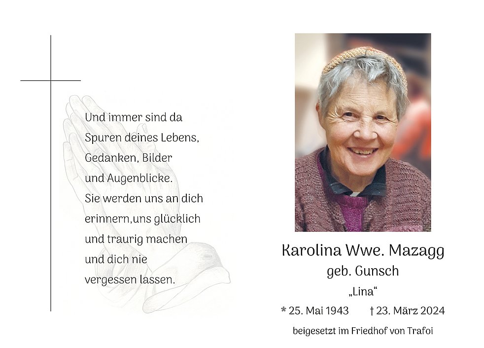 Am Dienstag, 26. März, um 13.30 Uhr beten wir den Rosenkranz; um 14 Uhr feiern wir den Begräbnisgottesdienst mit anschließender Verabschiedung in der Pfarrkirche von Trafoi.
