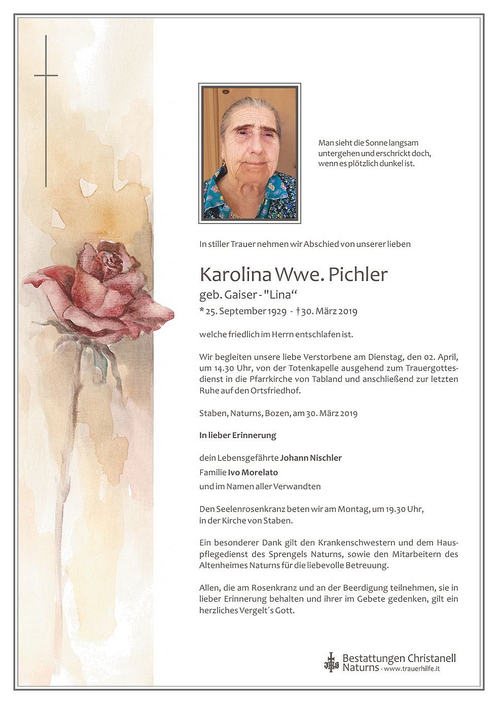 Ein besonderer Dank gilt den Krankenschwestern und dem Hauspflegedienst des Sprengels Naturns, sowie den Mitarbeitern des Altenheimes Naturns für die liebevolle Betreuung.