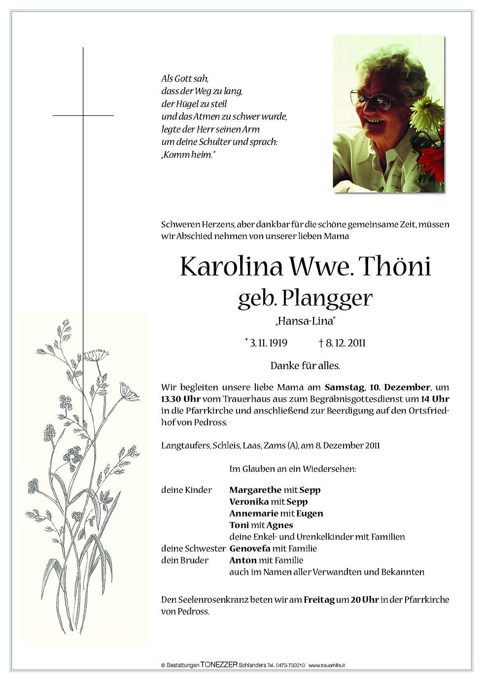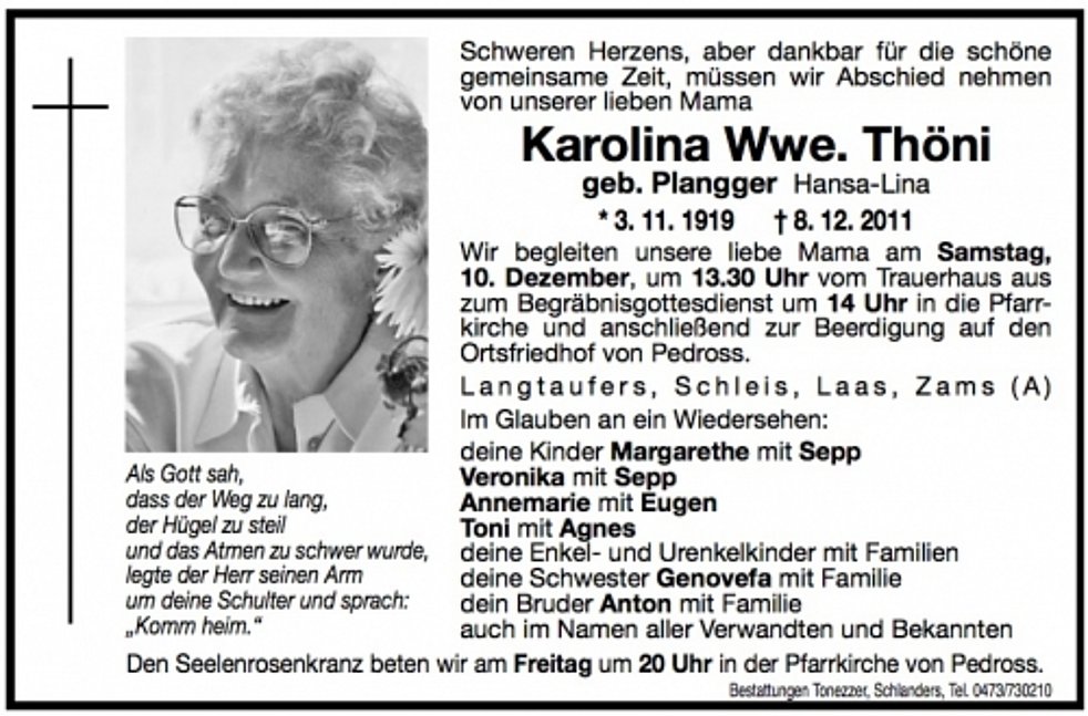 Wir begleiten unsere liebe Mama am Samstag, 10. Dezember, um 13.30 Uhr vom Trauerhaus aus zum Begräbnisgottesdienst um 14 Uhr in die Pfarrkirche und anschließend zur Beerdigung auf den Ortsfriedhof von Pedross.