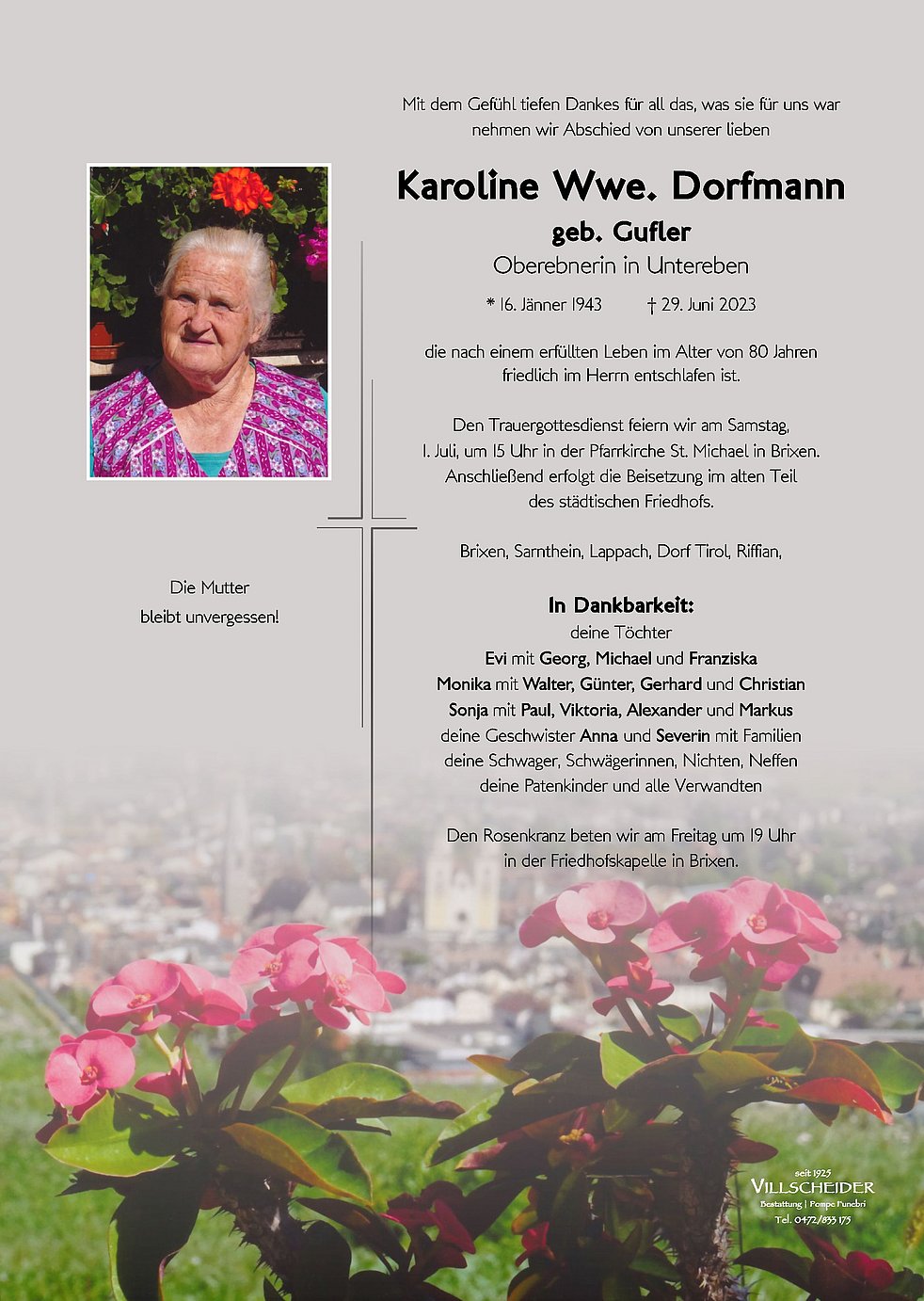 Begräbnisgottesdienst: 01.07. - 15:00 Uhr Brixen