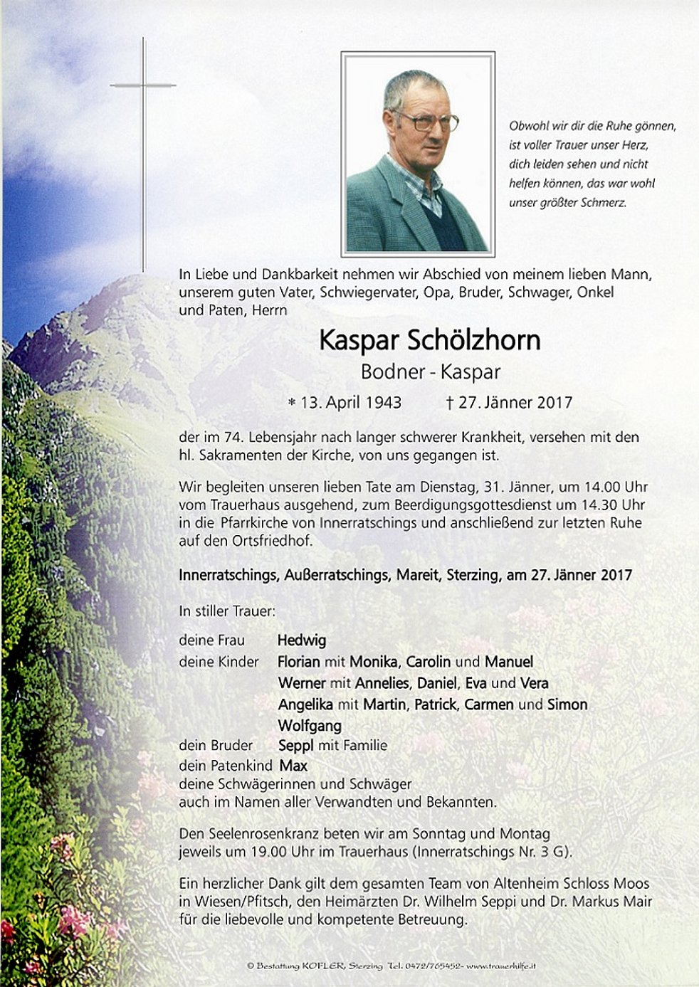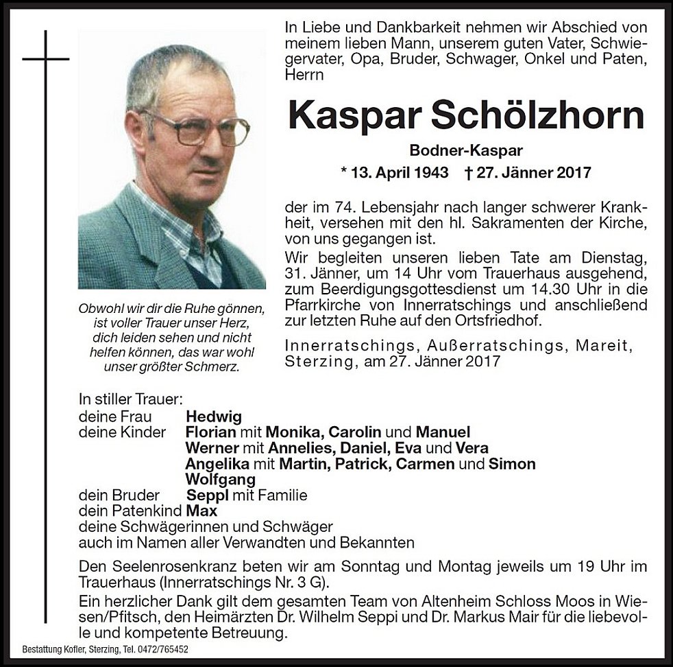 Wir begleiten unseren lieben Tate am Dienstag, 31. Jänner, um 14.00 Uhr vom Trauerhaus ausgehend, zum Beerdigungsgottesdienst um 14.30 Uhr in die Pfarrkirche von Innerratschings und anschließend zur letzten Ruhe auf den Ortsfriedhof.
