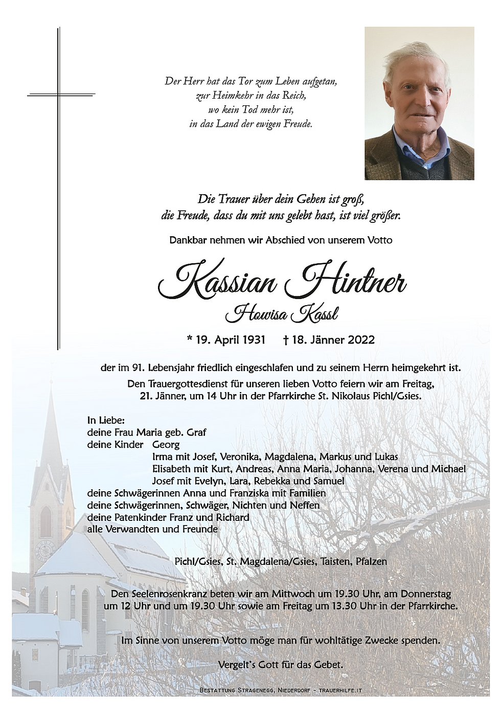 Den Trauergottesdienst für unseren lieben Votto feiern wir am Freitag, 21. Jänner, um 14 Uhr in der Pfarrkirche St. Nikolaus Pichl/Gsies.