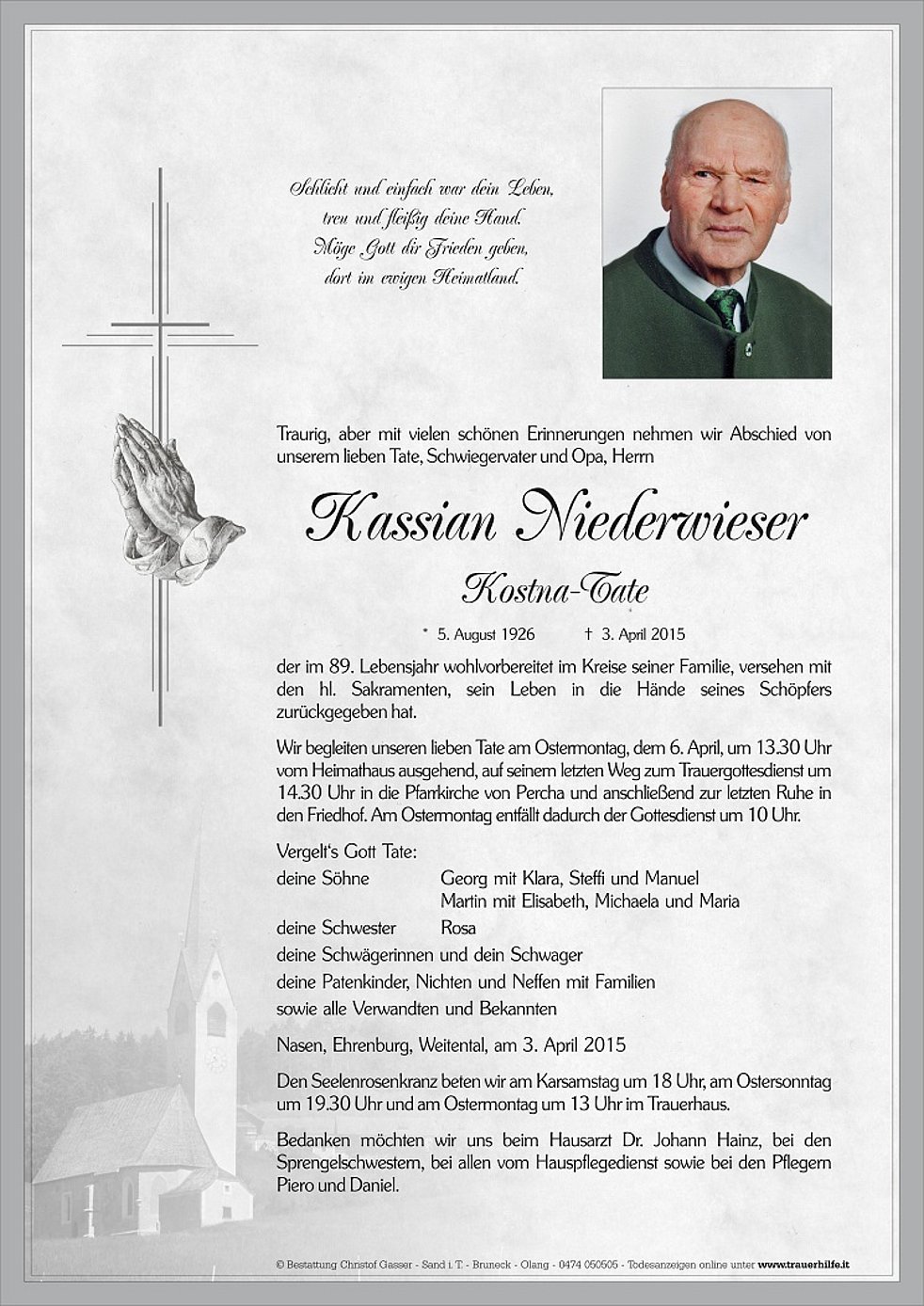 Wir begleiten unseren lieben Tate am Ostermontag, dem 6. April, um 13.30 Uhr vom Heimathaus ausgehend, auf seinem letzten Weg zum Trauergottesdienst um 14.30 Uhr in die Pfarrkirche von Percha und anschließend zur letzten Ruhe in den Friedhof. Am Ostermontag entfällt dadurch der Gottesdienst um 10 Uhr.