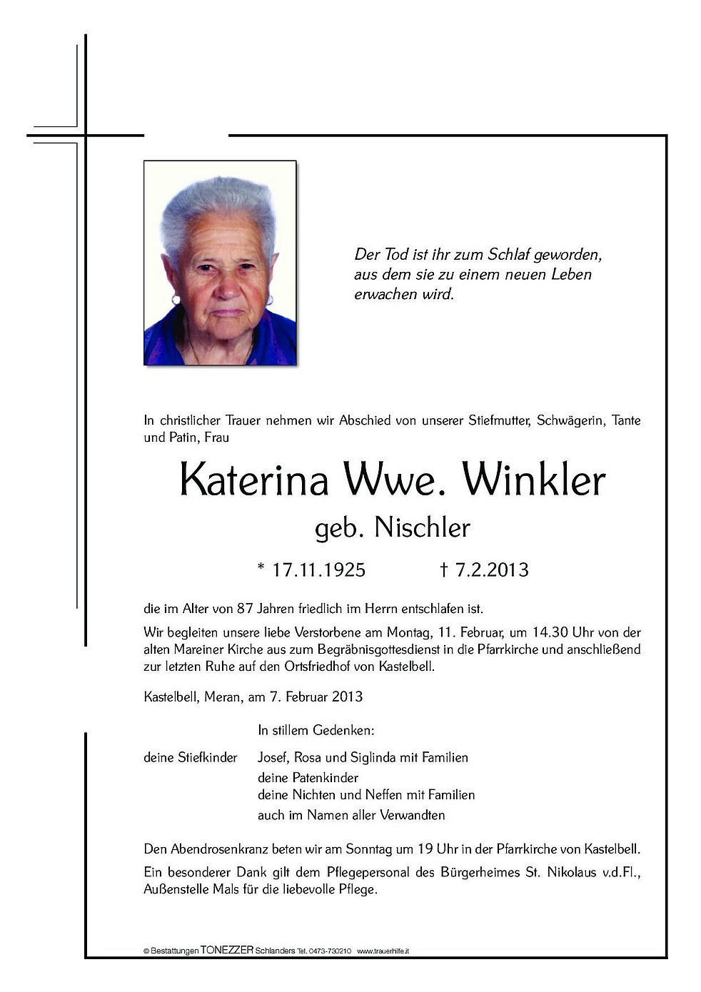 Wir begleiten unsere liebe Verstorbene am Montag, 11. Februar, um 14.30 Uhr von der alten Mareiner Kirche aus zum Begräbnisgottesdienst in die Pfarrkirche und anschließend zur letzten Ruhe auf den Ortsfriedhof von Kastelbell.