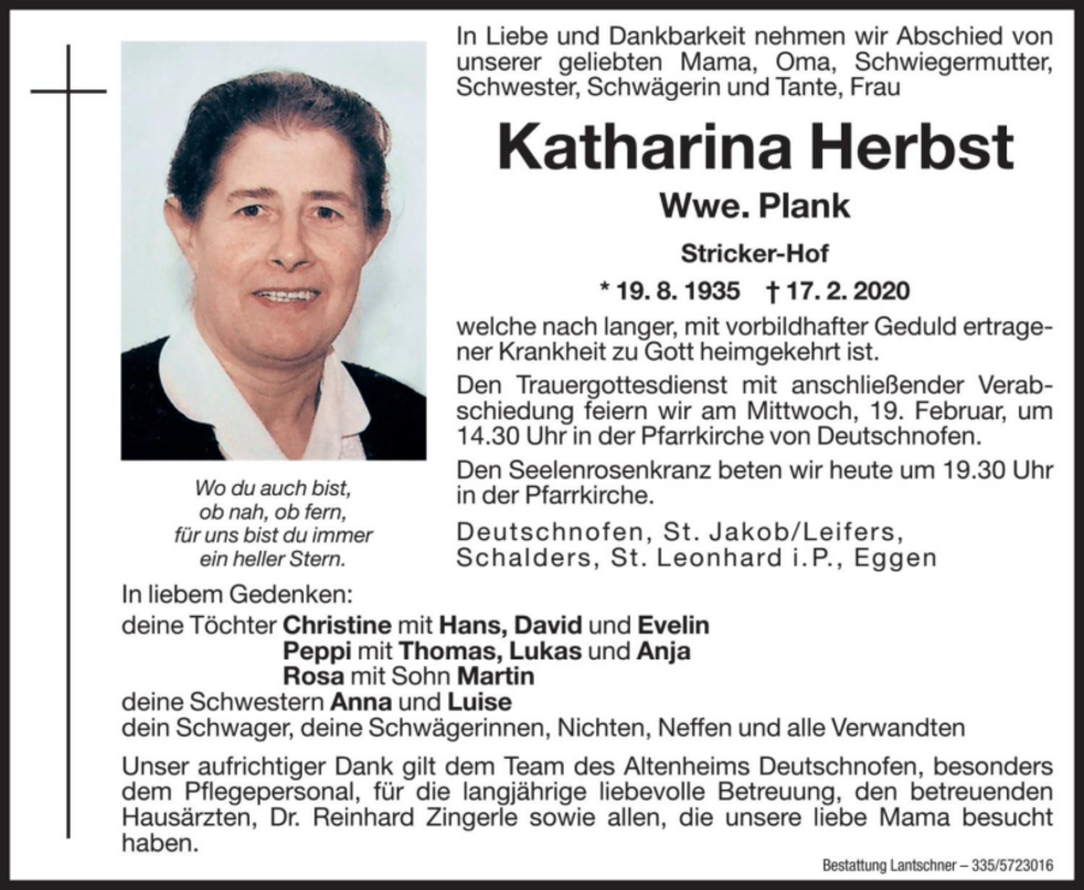 Dr. Reinhard Zingerle sowie allen, die unsere liebe Mama besucht haben.