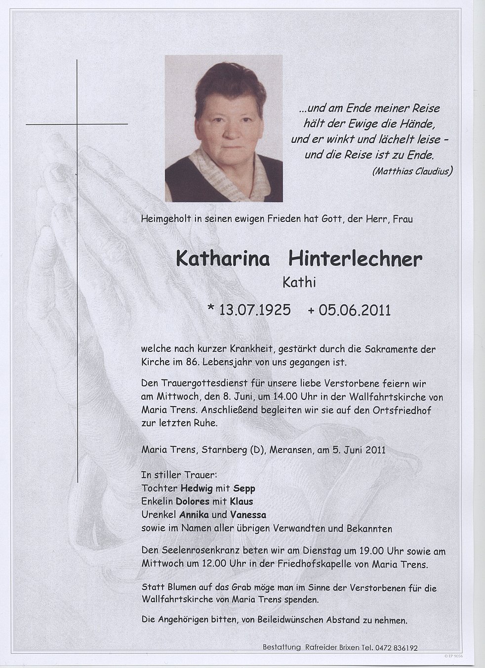 Besonders gedankt sei dem Hausarzt Dr. Eugen Sleiter, den Ärzten und dem Pflegepersonal der Abteilung Medizin am Krankenhaus Sterzing sowie dem Pflegepersonal vom Altersheim in Sterzing.
