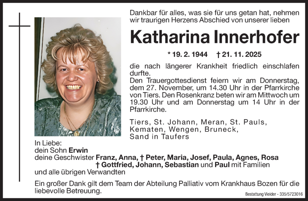 Den Trauergottesdienst feiern wir am Donnerstag, dem 27. November, um 14.30 Uhr in der Pfarrkirche von Tiers .