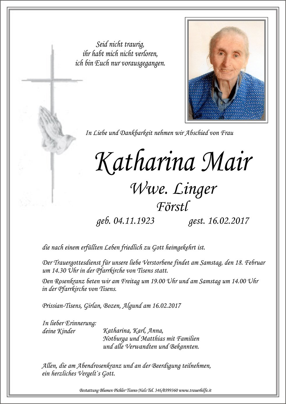 Der Trauergottesdienst für unsere liebe Verstorbene findet am Samstag, den 18. Februar um 14.30 Uhr in der Pfarrkirche von Tisens statt.