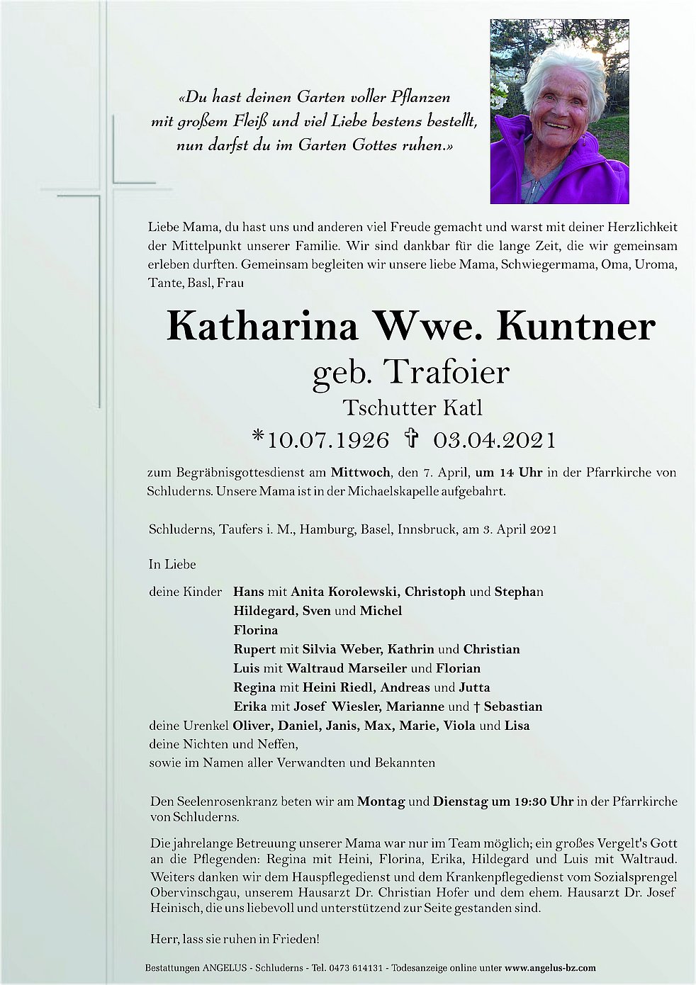zum Begräbnisgottesdienst am Mittwoch, den 7. April, um 14 Uhr in der Pfarrkirche von Schluderns. Unsere Mama ist in der Michaelskapelle aufgebahrt.